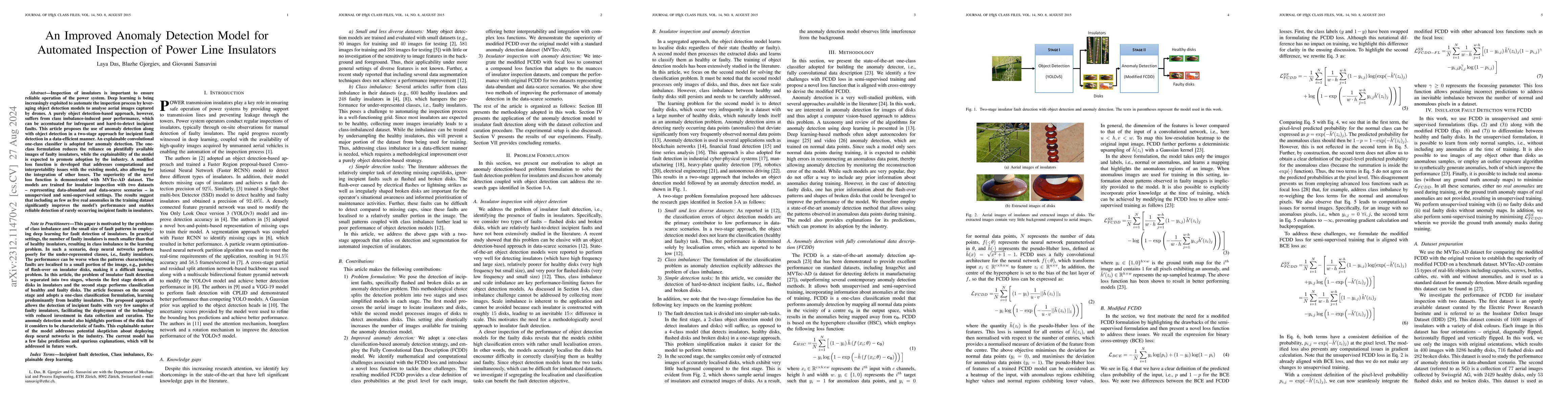 This paper proposes a two-stage deep learning approach for automated inspection of power line insulators, combining object detection with anomaly detection to improve fault detection accuracy, especially for rare faults. The anomaly detection model, trained in an unsupervised and semi-supervised manner, significantly enhances performance with minimal real anomaly data, demonstrating reliable detection of incipient faults.