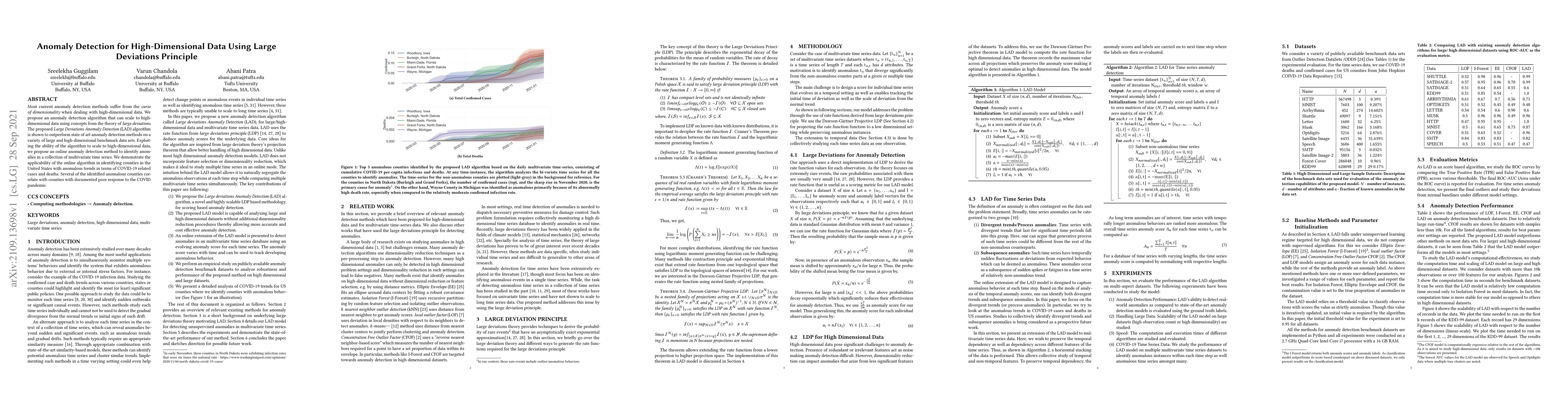 This paper proposes a Large Deviations Anomaly Detection (LAD) algorithm to effectively address the curse of dimensionality in high-dimensional data. The LAD algorithm outperforms existing methods on benchmark datasets and is applied to identify anomalous COVID-19 trends in U.S. counties, correlating findings with poor pandemic responses.