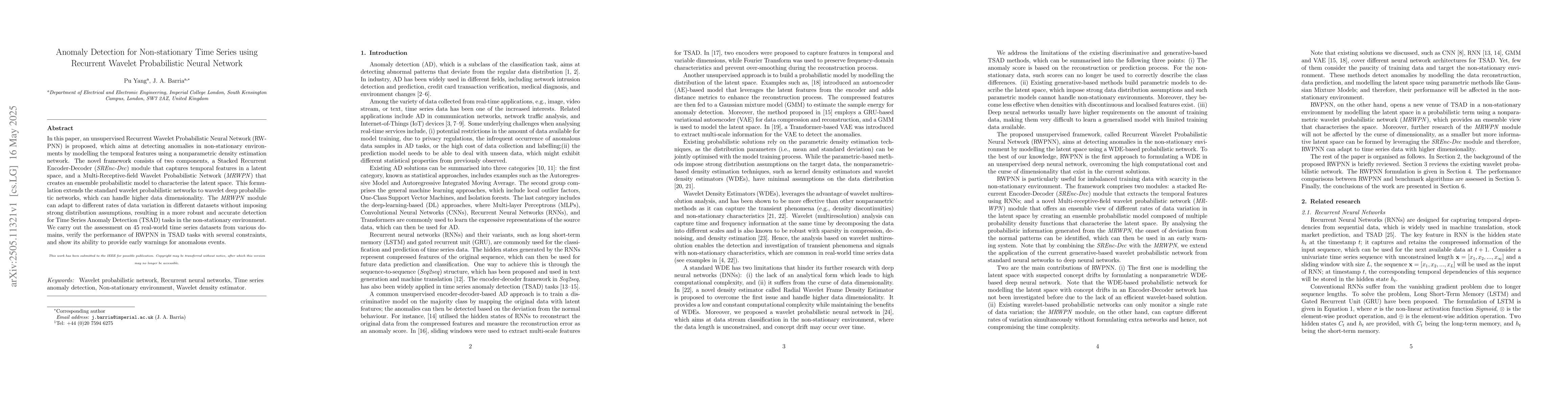 The research proposes an unsupervised Recurrent Wavelet Probabilistic Neural Network (RWPNN) for anomaly detection in non-stationary time series. It consists of a Stacked Recurrent Encoder-Decoder (SREnc-Dec) module for temporal feature extraction in latent space and a Multi-Receptive-field Wavelet Probabilistic Network (MRWPN) for probabilistic modeling of the latent space, extending standard wavelet probabilistic networks to handle higher dimensional data.