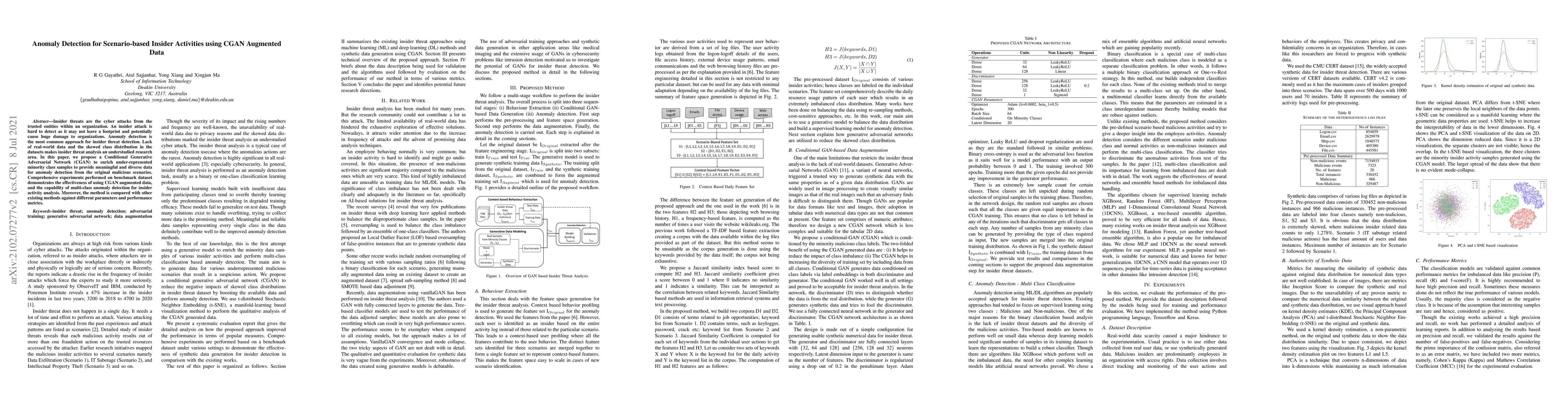 This paper proposes a method combining Conditional Generative Adversarial Networks (CGAN) with supervised learning to detect insider threats through multi-class anomaly detection. The approach uses synthetic data to address data imbalance and demonstrates improved performance compared to existing methods.