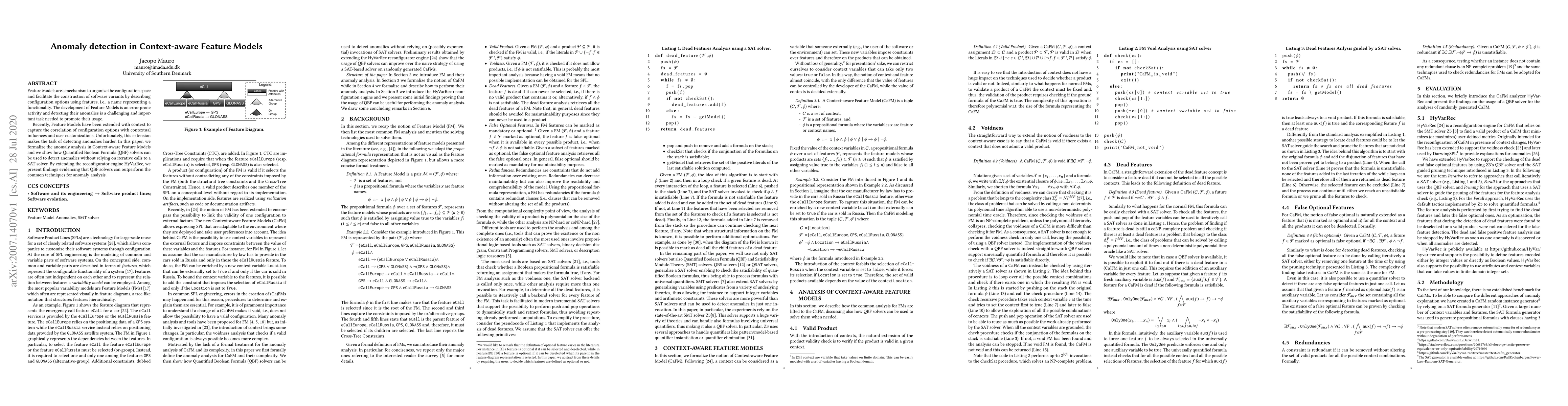This paper formalizes anomaly detection in context-aware Feature Models, which describe software configuration options with contextual influences. It demonstrates that Quantified Boolean Formula (QBF) solvers can detect anomalies more efficiently than traditional SAT solvers, as shown by extending the HyVarRec reconfigurator engine.