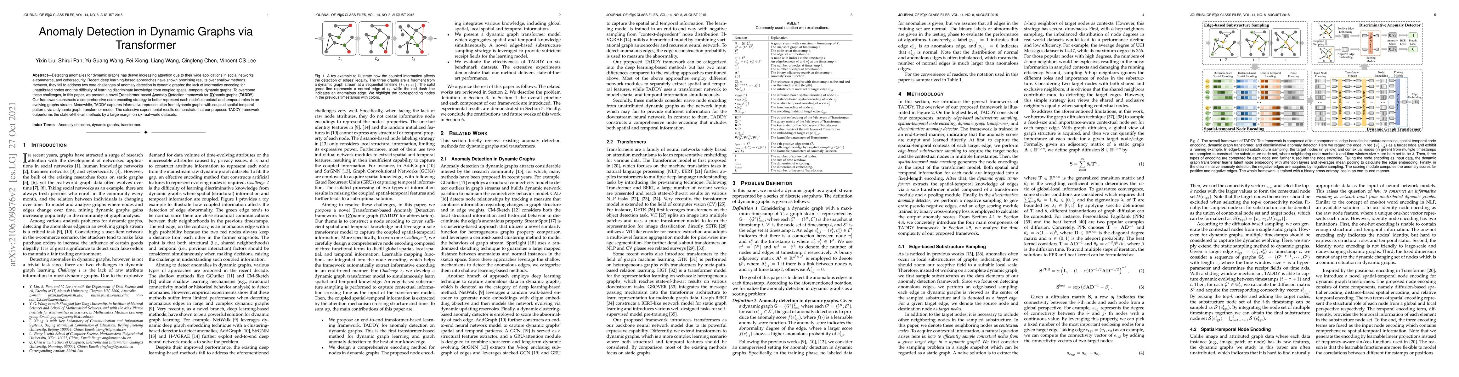This paper introduces TADDY, a novel Transformer-based framework for detecting anomalies in dynamic graphs, addressing the challenges of unattributed nodes and coupled spatial-temporal patterns. TADDY outperforms existing methods on six real-world datasets.