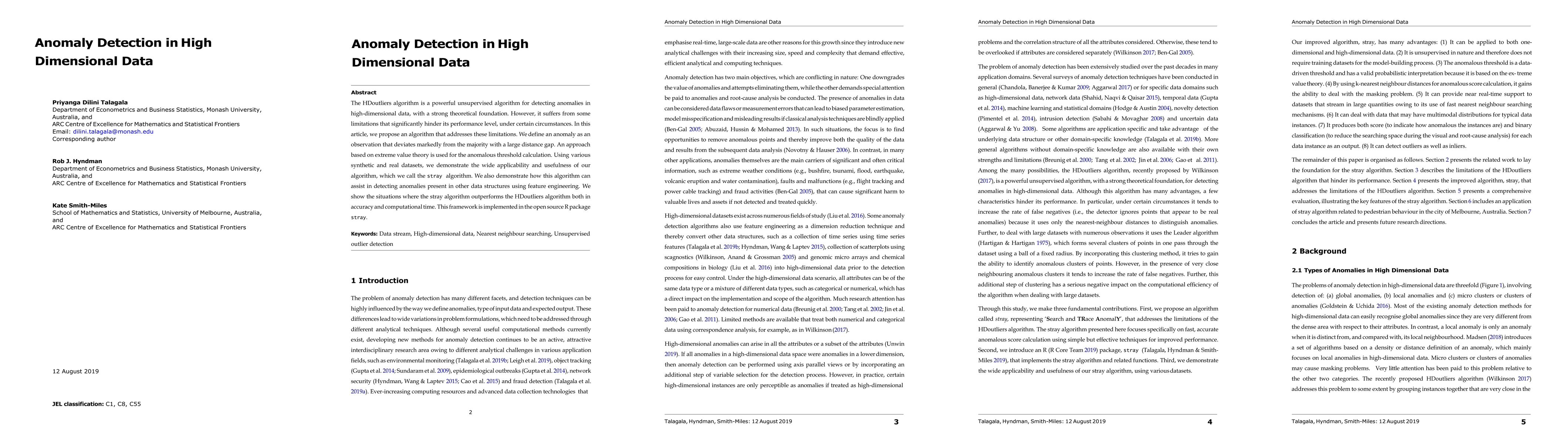 The HDoutliers algorithm is a powerful unsupervised algorithm for detecting anomalies in high-dimensional data, with a strong theoretical foundation. However, it suffers from some limitations that significantly hinder its performance level, under certain circumstances. In this article, we propose an algorithm that addresses these limitations. We define an anomaly as an observation that deviates markedly from the majority with a large distance gap. An approach based on extreme value theory is used for the anomalous threshold calculation. Using various synthetic and real datasets, we demonstrate the wide applicability and usefulness of our algorithm, which we call the stray algorithm. We also demonstrate how this algorithm can assist in detecting anomalies present in other data structures using feature engineering. We show the situations where the stray algorithm outperforms the HDoutliers algorithm both in accuracy and computational time. This framework is implemented in the open source R package stray.
