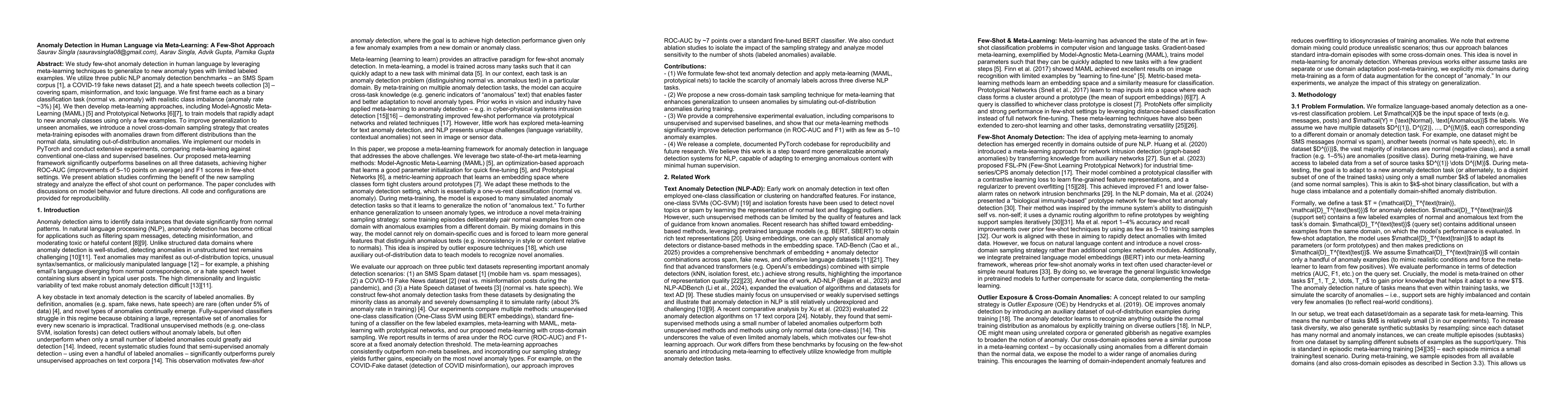 The research proposes a meta-learning framework for few-shot anomaly detection in human language across diverse domains with limited labeled data, utilizing episodic training, prototypical networks, and domain resampling.