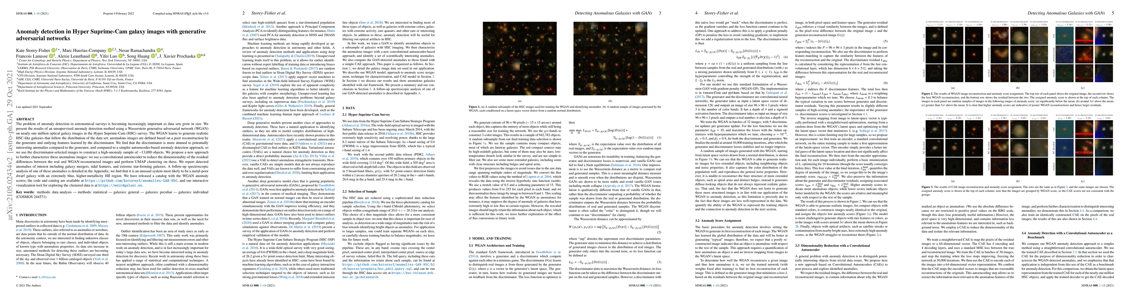 This paper presents an unsupervised anomaly detection method using a Wasserstein generative adversarial network (WGAN) on nearly one million galaxy images from the Hyper Suprime-Cam survey. The discriminator of the WGAN identifies anomalies more effectively than the generator, leading to a high-anomaly sample of approximately 13,000 objects, which includes galaxy mergers, tidal features, and extreme star-forming galaxies.