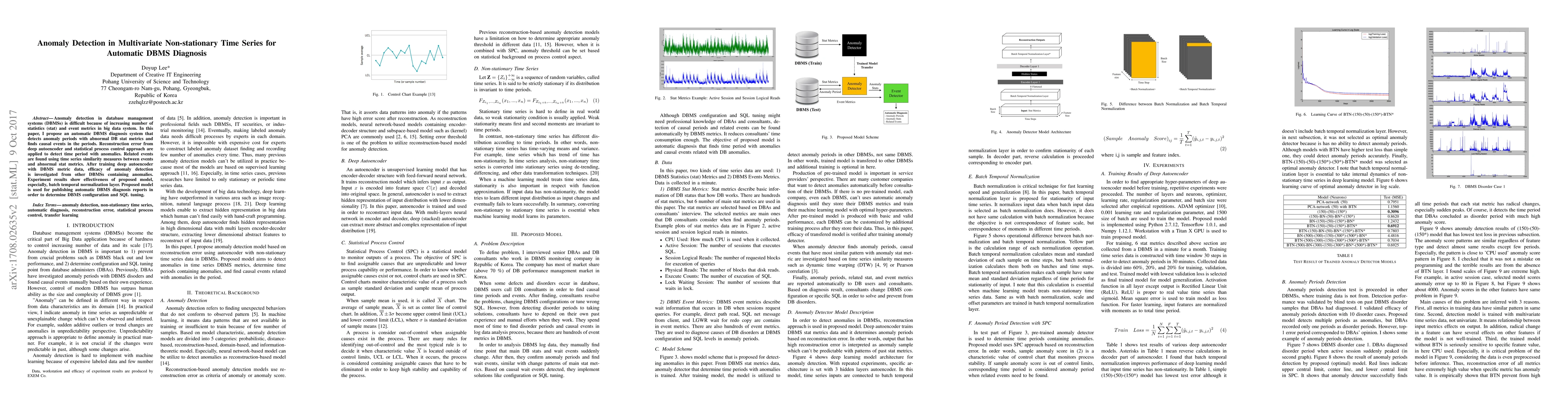 This paper proposes an automatic DBMS diagnosis system using deep autoencoders and statistical process control to detect anomalies in database metrics and identify causal events. Experimental results demonstrate the model's effectiveness, especially with a batch temporal normalization layer, for generating DBMS diagnosis reports.