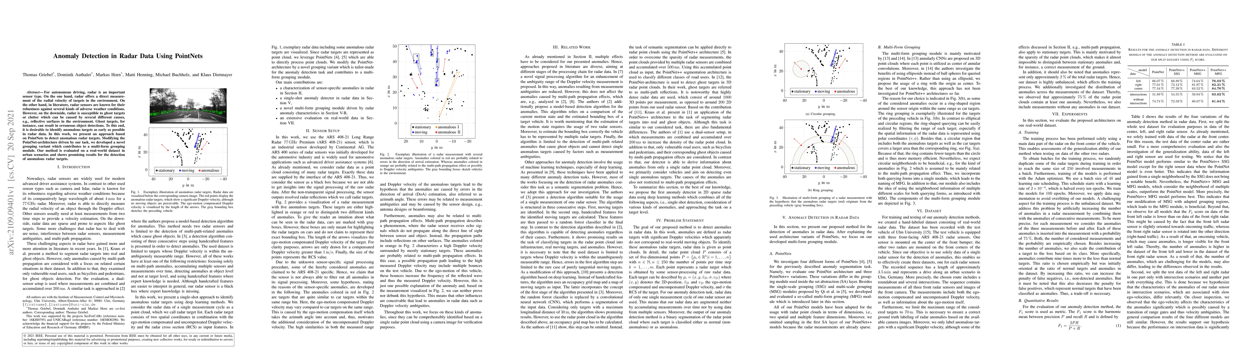 The paper presents an approach for anomaly detection in radar data using PointNets, modifying the PointNet architecture with a novel grouping variant to form a multi-form grouping module. The method is evaluated on a real-world dataset in urban scenarios.