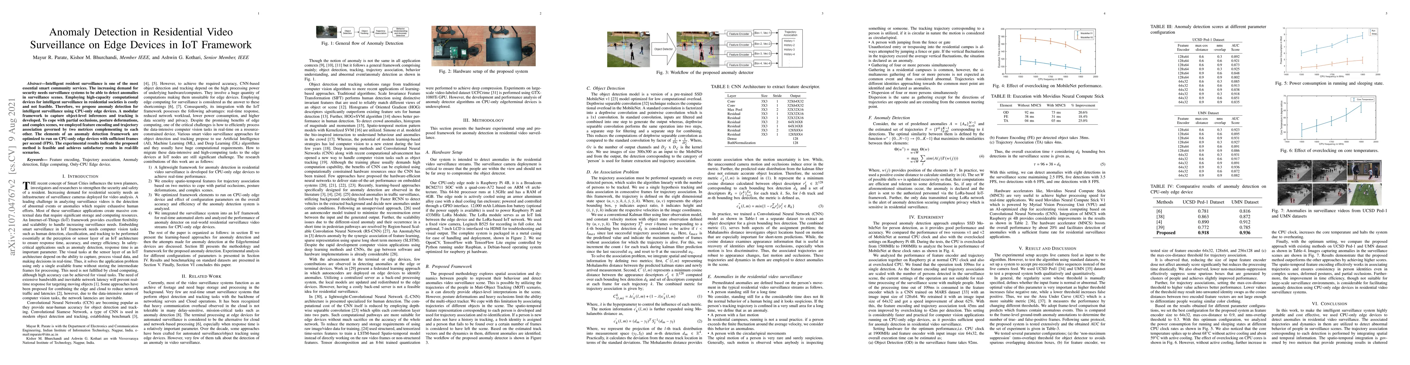 This paper proposes an anomaly detection system for residential surveillance using CPU-only edge devices within an IoT framework. The developed modular framework captures object-level inferences and tracking, achieving satisfactory results in real-life scenarios despite complex scenes and partial occlusions.