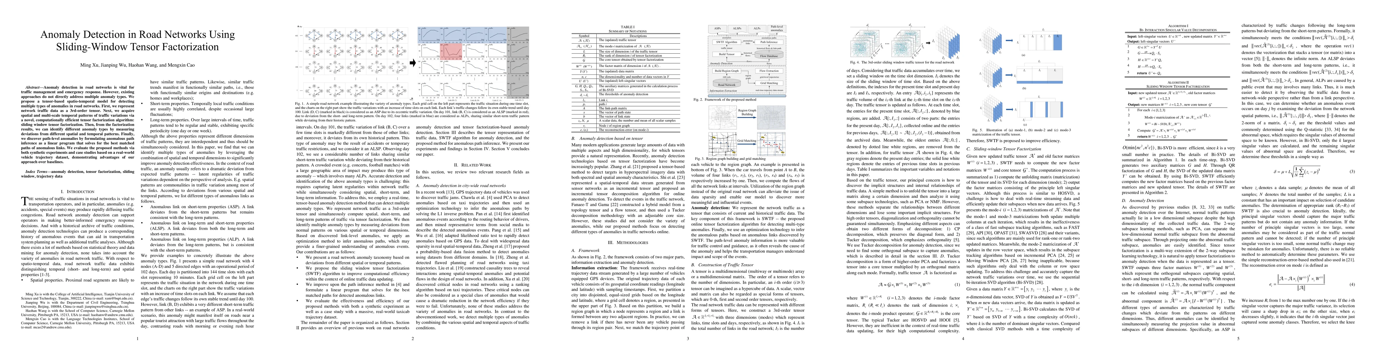This paper proposes a tensor-based spatio-temporal model for detecting multiple types of anomalies in road networks using sliding-window tensor factorization. The method identifies anomalies by measuring deviations from spatial and temporal patterns derived from traffic data represented as a 3rd-order tensor.