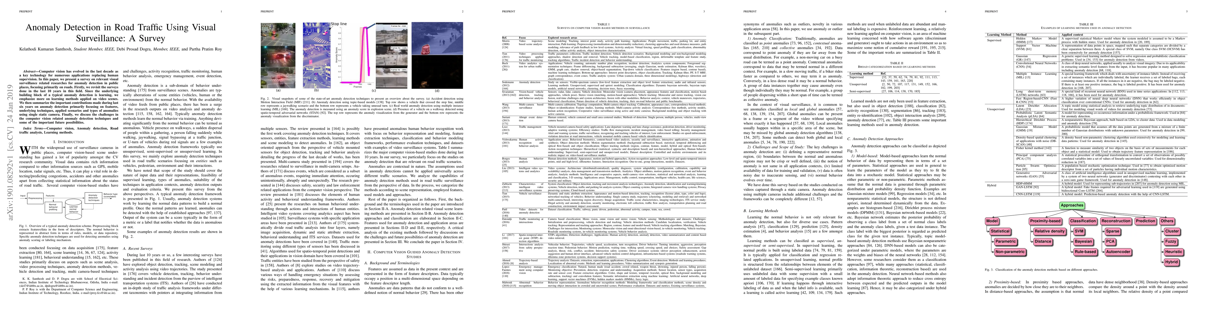This paper surveys visual surveillance techniques for detecting anomalies in road traffic using computer vision, emphasizing learning methods and contributions from the past six years. It highlights challenges and future possibilities in this evolving field.