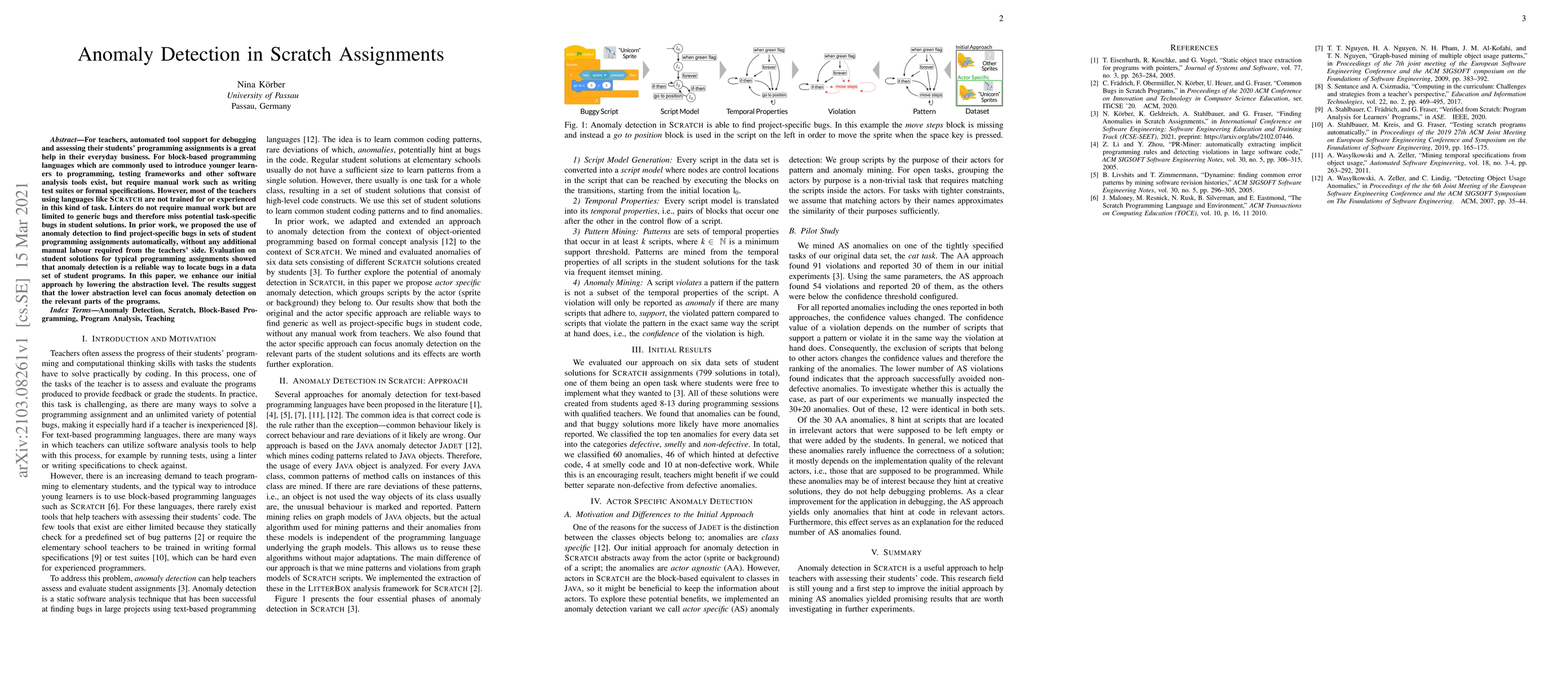 This paper improves an anomaly detection method for identifying bugs in Scratch programming assignments, eliminating the need for teacher input beyond setting up the tool. The approach focuses on a lower abstraction level, enhancing precision in pinpointing task-specific errors in student programs, as demonstrated by successful evaluation on typical assignments.