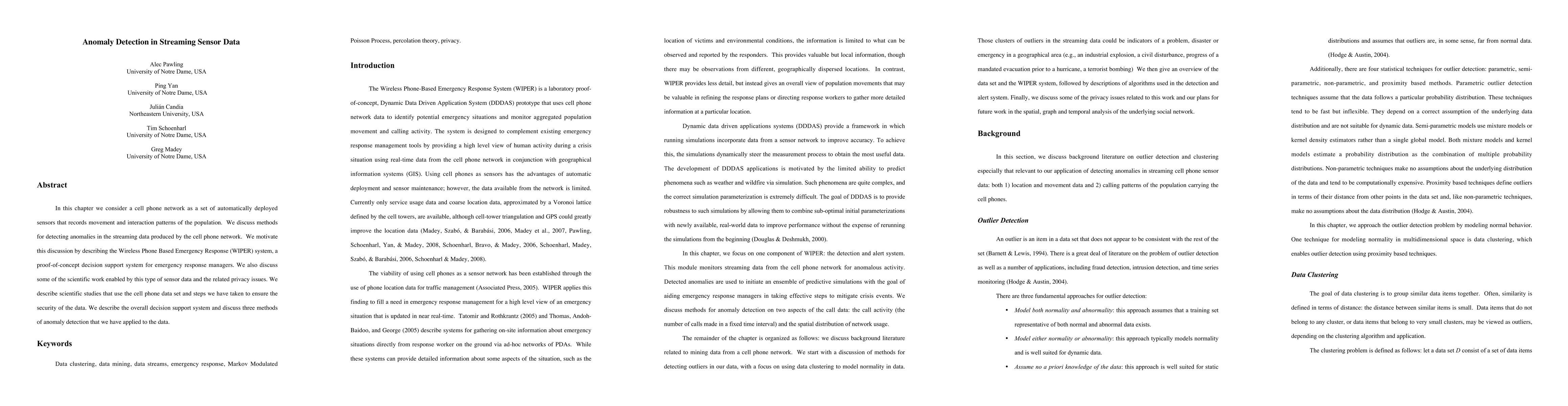 This paper explores methods for detecting anomalies in streaming sensor data from a cell phone network, using the WIPER system as a case study for emergency response. It discusses three applied anomaly detection methods and addresses privacy concerns while ensuring data security.