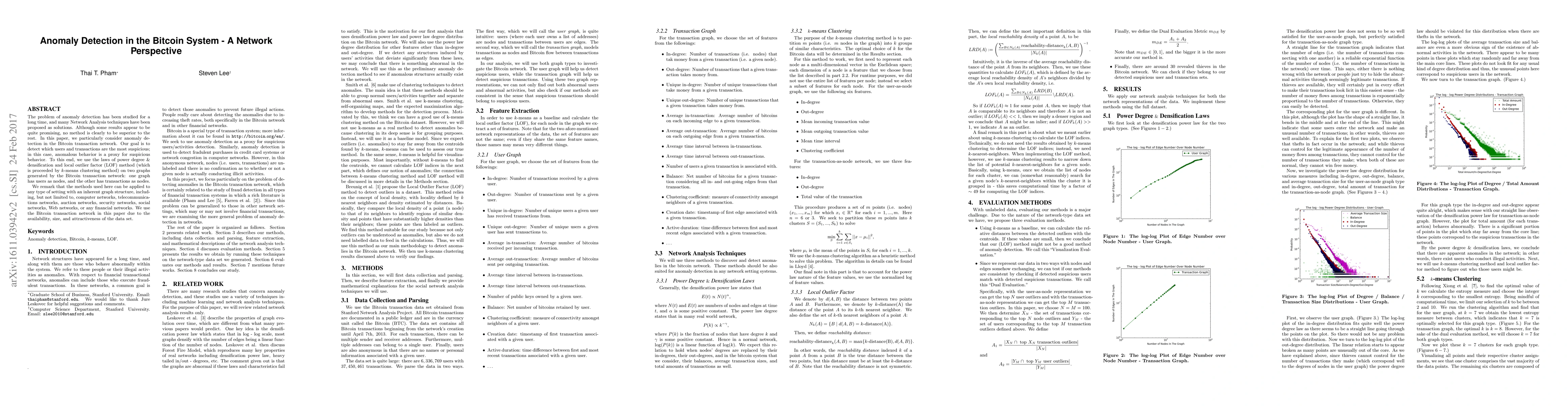 This paper explores anomaly detection in the Bitcoin transaction network using network analysis techniques, focusing on identifying suspicious users and transactions. It employs the power degree law, densification, and the LOF method preceded by k-means clustering on two graph representations of the network.