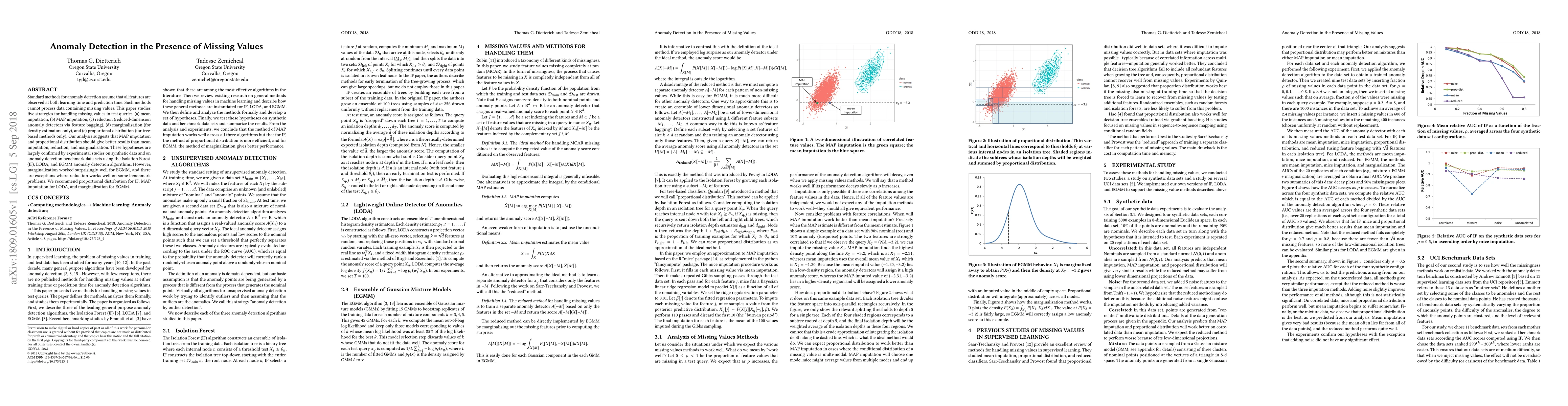 This paper studies five strategies for handling missing values in test queries: mean imputation, MAP imputation, reduction (reduced-dimension anomaly detectors via feature bagging), marginalization (for density estimators only), and proportional distribution (for tree-based methods only).