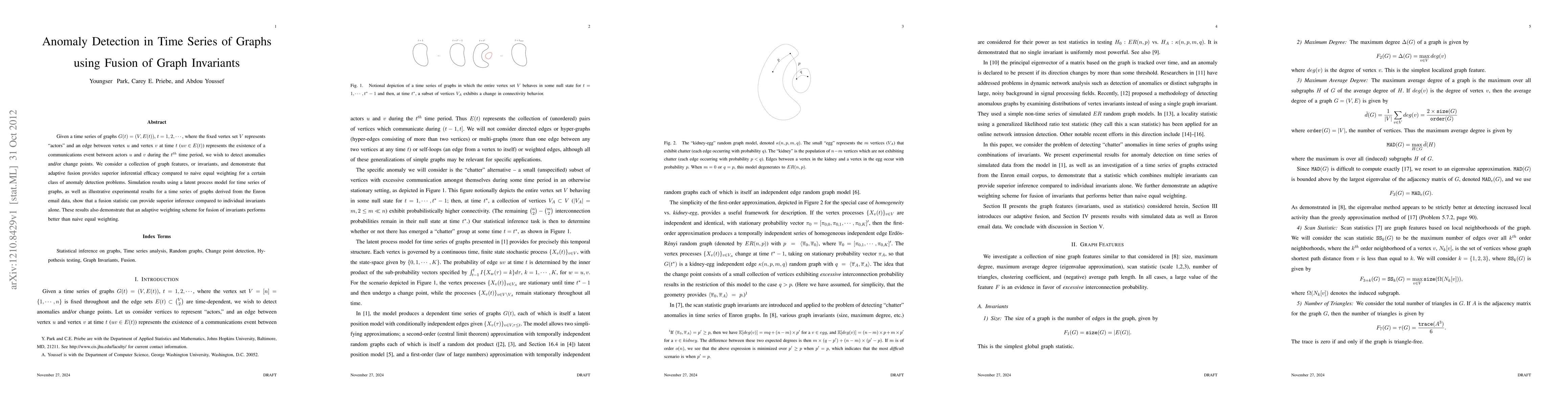 This paper proposes a method for detecting anomalies in time series of graphs by adaptively fusing graph invariants, showing superior performance compared to equal weighting. Simulation and Enron email data results demonstrate that the fusion statistic outperforms individual invariants and naive equal weighting.