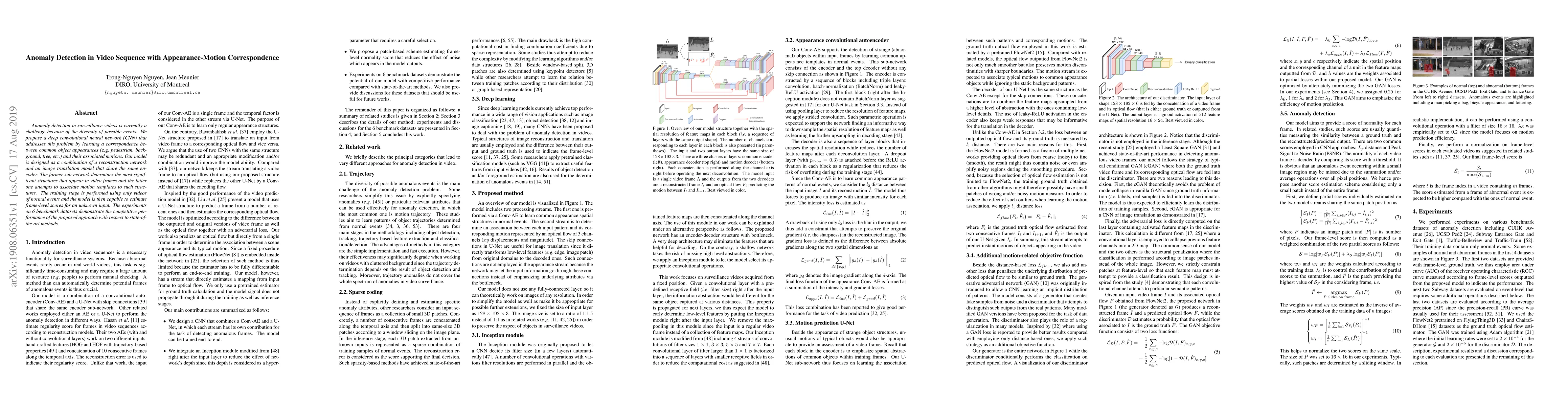 This paper proposes a deep convolutional neural network for anomaly detection in surveillance videos by learning correspondences between object appearances and their motions. The model combines a reconstruction network and an image translation model to identify significant structures and associate motion templates, achieving competitive performance on benchmark datasets.