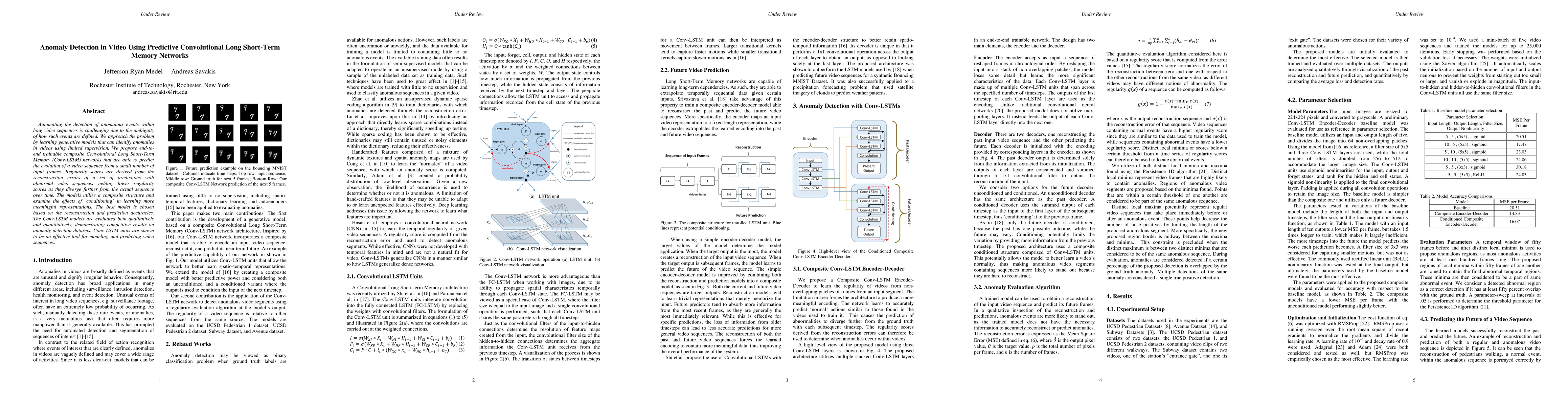 Automating the detection of anomalous events within long video sequences is challenging due to the ambiguity of how such events are defined. We approach the problem by learning generative models that can identify anomalies in videos using limited supervision. We propose end-to-end trainable composite Convolutional Long Short-Term Memory (Conv-LSTM) networks that are able to predict the evolution of a video sequence from a small number of input frames. Regularity scores are derived from the reconstruction errors of a set of predictions with abnormal video sequences yielding lower regularity scores as they diverge further from the actual sequence over time. The models utilize a composite structure and examine the effects of conditioning in learning more meaningful representations. The best model is chosen based on the reconstruction and prediction accuracy. The Conv-LSTM models are evaluated both qualitatively and quantitatively, demonstrating competitive results on anomaly detection datasets. Conv-LSTM units are shown to be an effective tool for modeling and predicting video sequences.