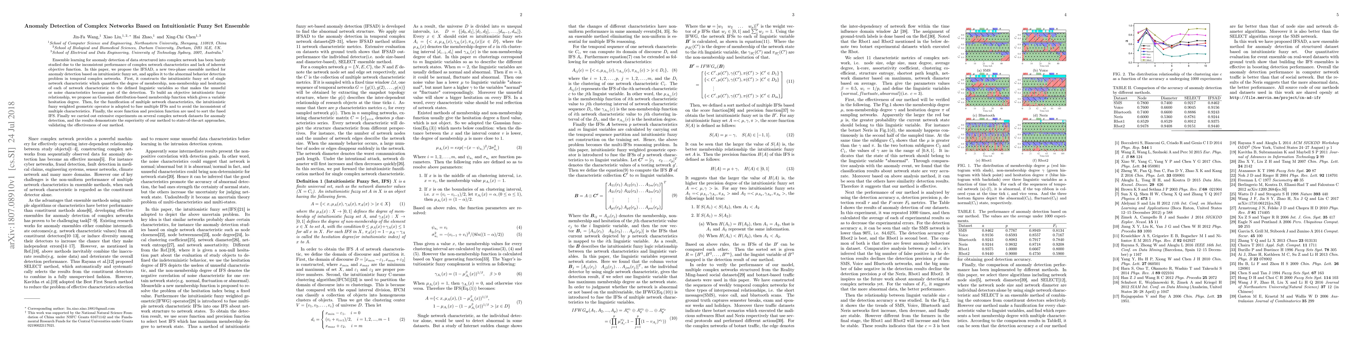 This paper proposes IFSAD, a two-phase ensemble method for anomaly detection in complex networks using intuitionistic fuzzy sets. It constructs intuitionistic fuzzy sets to quantify network characteristics and employs a Gaussian distribution-based membership function to manage hesitation degrees, ultimately demonstrating superior performance over state-of-the-art methods in experiments.