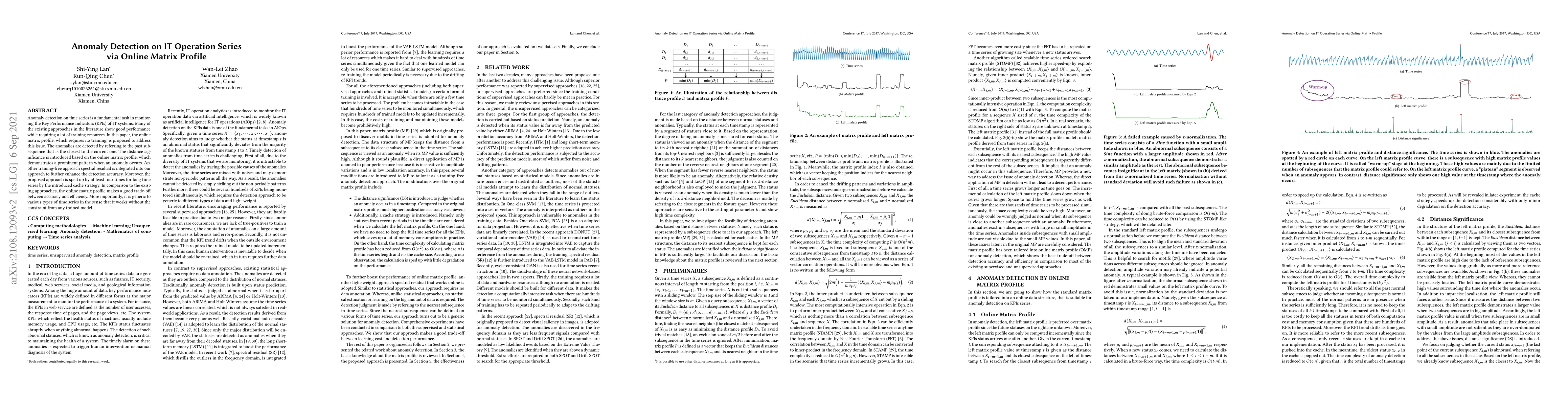This paper proposes an anomaly detection method for IT operation time series using the online matrix profile, which requires no training and compares current subsequences to the closest past ones. It integrates spectral residual for enhanced accuracy and employs a cache strategy to speed up processing, achieving a good balance between accuracy and efficiency without the need for a trained model.