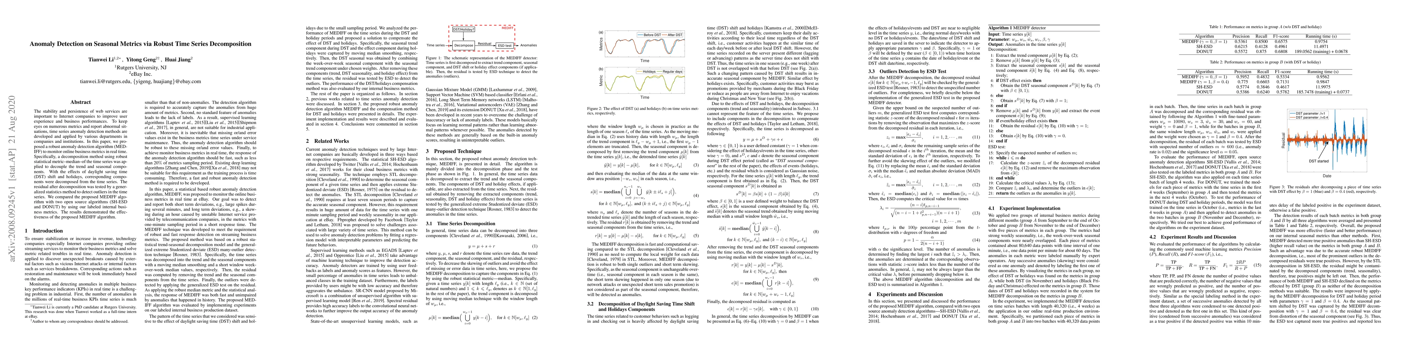 This paper proposes a robust MEDIFF algorithm for real-time anomaly detection in online business metrics by decomposing time series into trend and seasonal components using median statistics. The method effectively identifies outliers, outperforming two open-source algorithms in internal business metrics tests.