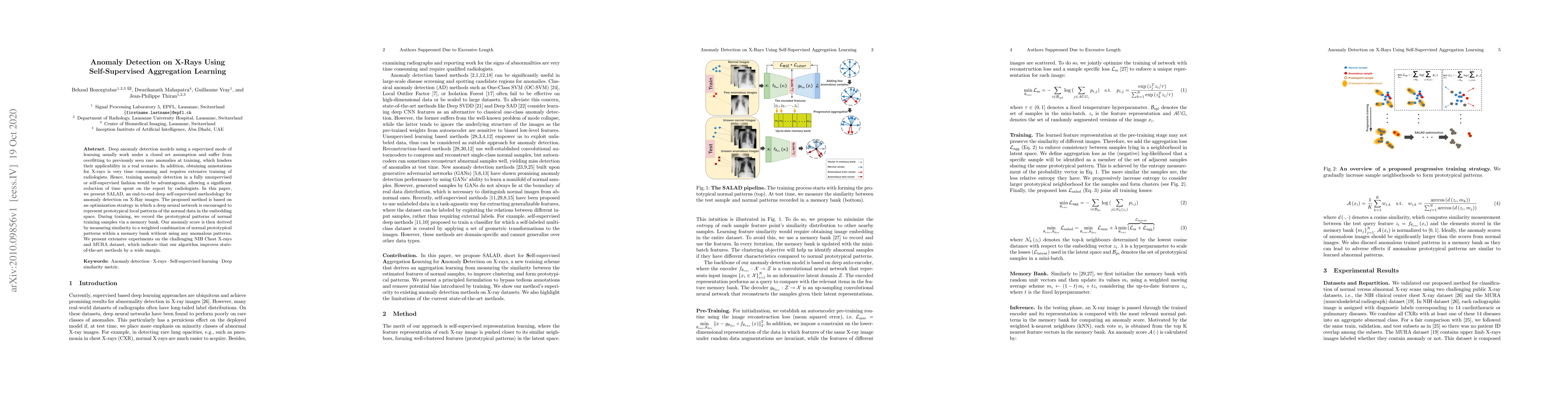 This paper presents SALAD, a self-supervised deep learning approach for detecting anomalies in X-ray images without requiring labeled data. The method leverages a memory bank to capture normal patterns and measures anomaly scores based on their similarity to these patterns, significantly improving over existing supervised methods.