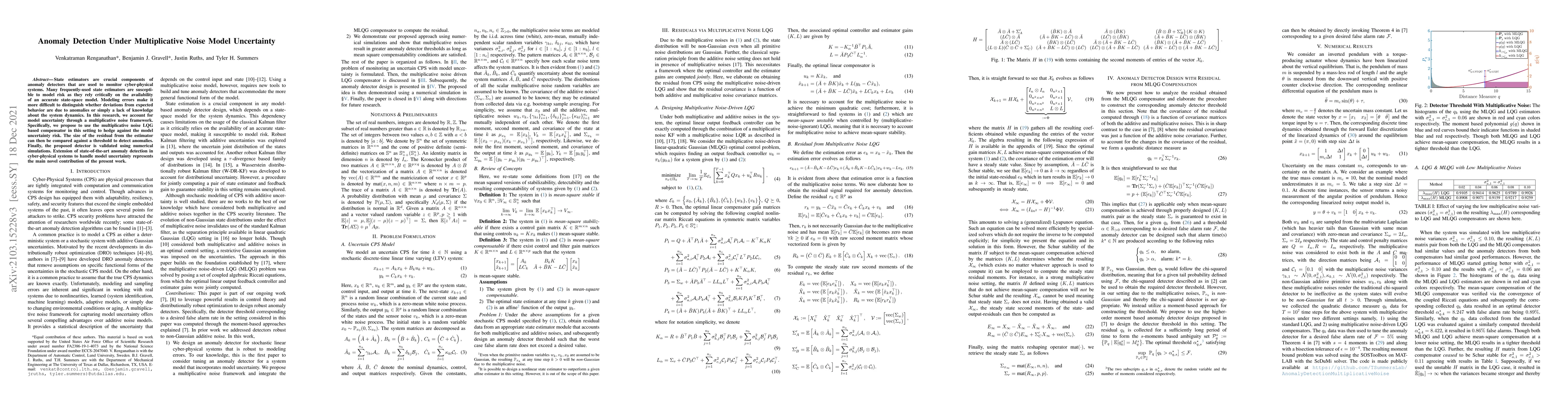 This research introduces a method to detect anomalies in cyber-physical systems that accounts for model uncertainty, using a multiplicative noise LQG compensator. The approach enhances anomaly detection by comparing residual sizes to a threshold, offering a novel extension to current state-of-the-art techniques.