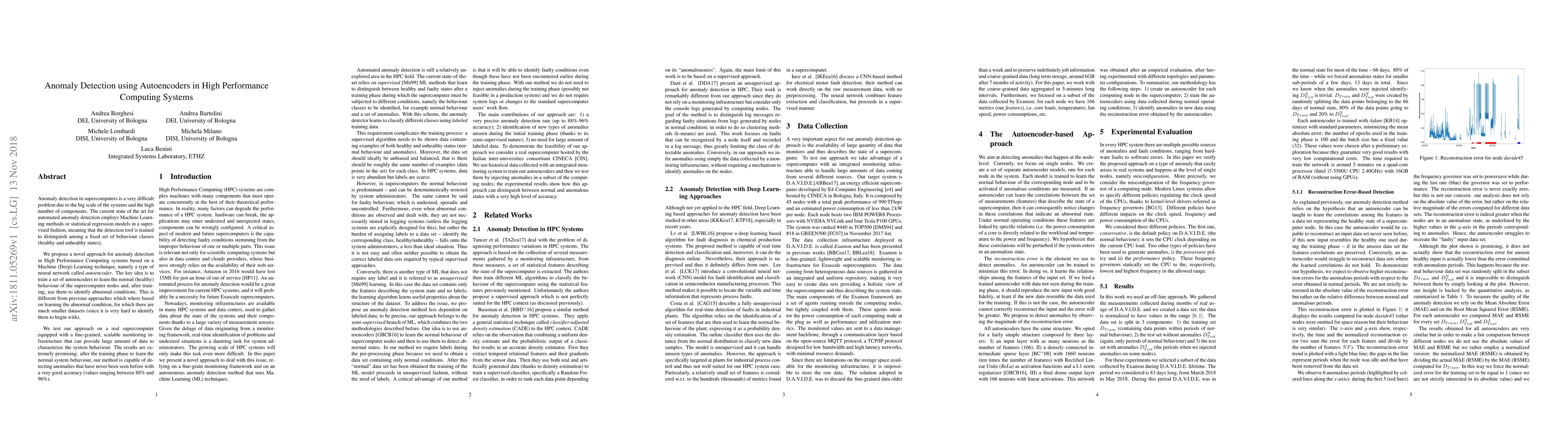 This paper proposes an innovative autoencoder-based approach for anomaly detection in High Performance Computing systems, training the autoencoders to recognize normal behavior and identify deviations, achieving high detection accuracy for unseen anomalies. The method shows promising results on a real supercomputer with extensive monitoring data.