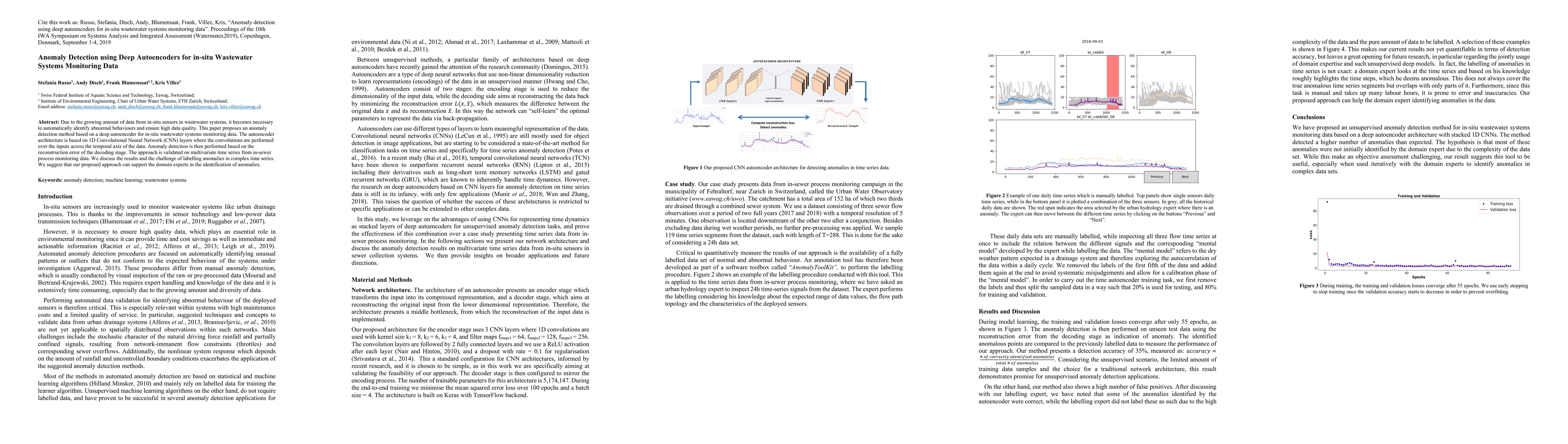 This paper proposes a deep autoencoder with 1D Convolutional Neural Network layers for detecting anomalies in wastewater system monitoring data. The method uses reconstruction error to identify abnormal behaviors, validated on multivariate time series data, and suggests aiding domain experts in anomaly identification.