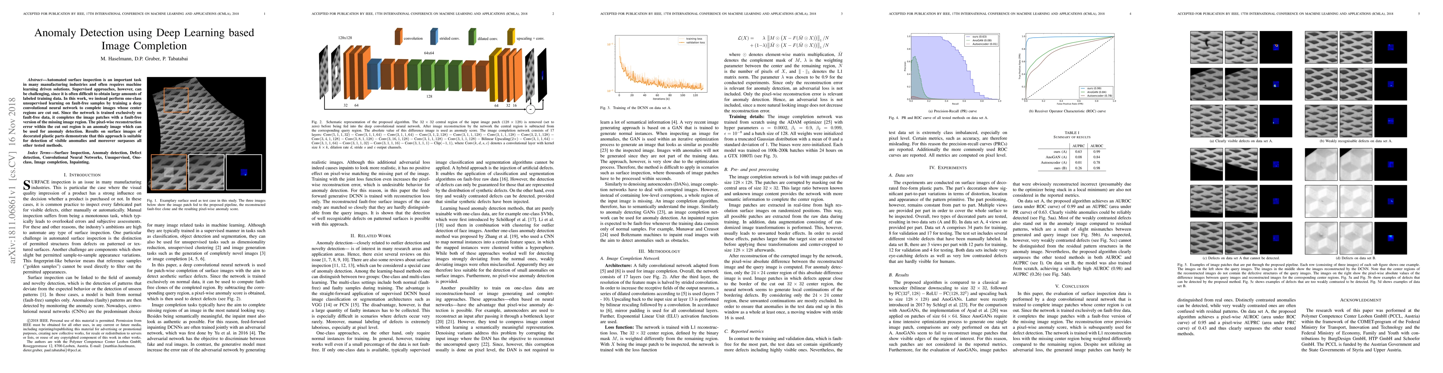 This paper proposes an unsupervised deep learning method for anomaly detection in surface inspection by training a deep convolutional neural network to complete images with missing center regions. The reconstruction error in the completed region serves as an anomaly image, effectively detecting visible anomalies in plastic parts.