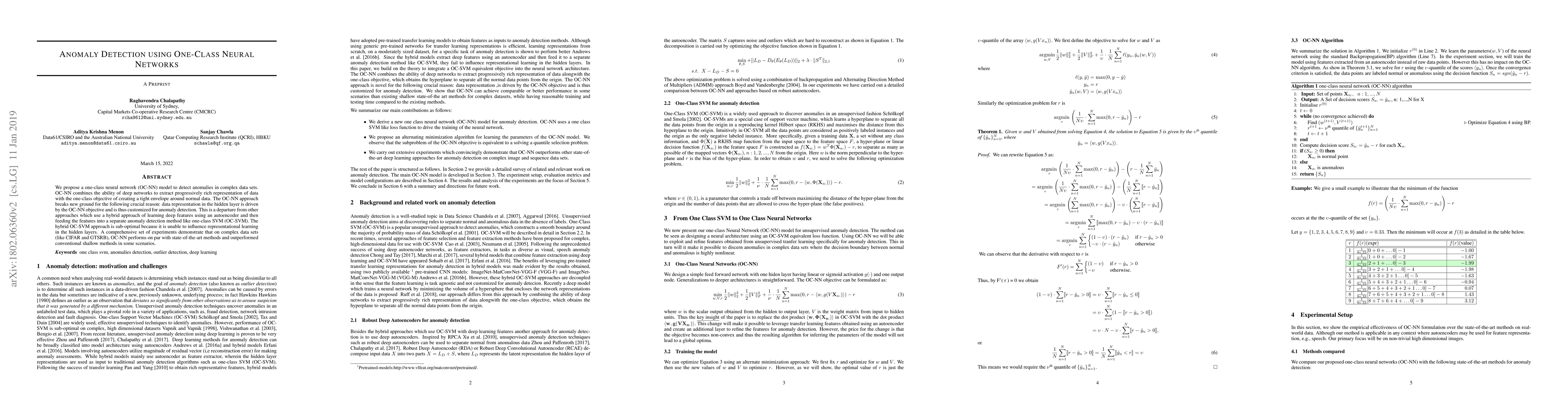 This paper proposes a one-class neural network (OC-NN) model for anomaly detection, which tailors the data representation in hidden layers to the anomaly detection objective, outperforming hybrid methods like autoencoder-based OC-SVM. Experiments show OC-NN matches or exceeds state-of-the-art performance on complex datasets.