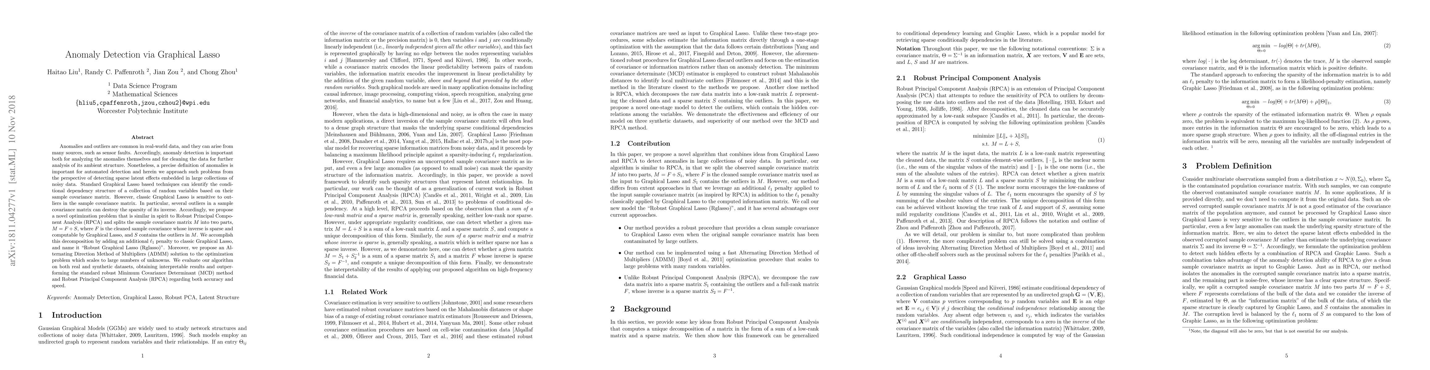 This paper proposes a Robust Graphical Lasso (Rglasso) method to detect anomalies in large, noisy datasets by decomposing the sample covariance matrix into a sparse, clean part and an outlier part. The method outperforms standard robust techniques in accuracy and speed, as demonstrated on both real and synthetic datasets.