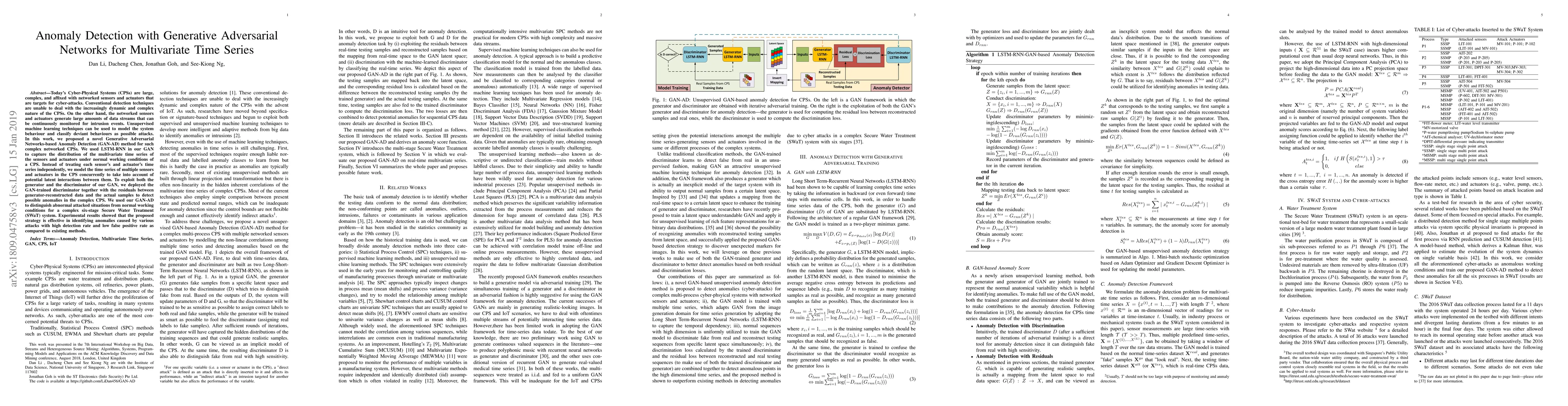 This paper proposes a novel Generative Adversarial Networks (GAN)-based Anomaly Detection (GAN-AD) method for complex Cyber-Physical Systems (CPSs) that models multivariate time series data from networked sensors and actuators. The GAN-AD method effectively identifies anomalies by leveraging both the generator and discriminator of the GAN, achieving high detection rates and low false positive rates in a Secure Water Treatment system.