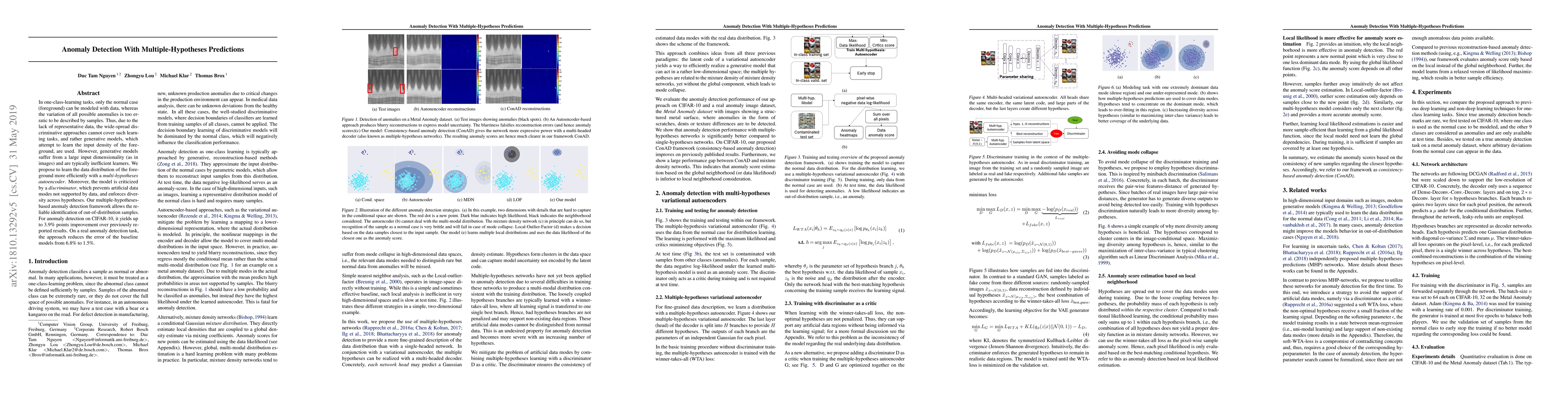 This paper proposes a multi-hypotheses autoencoder for efficient anomaly detection in one-class learning tasks, where generative models are used due to the lack of anomaly data. The model improves anomaly detection accuracy by learning diverse hypotheses and using a discriminator to enforce data-supported diversity, achieving better results on CIFAR-10 and real-world datasets.
