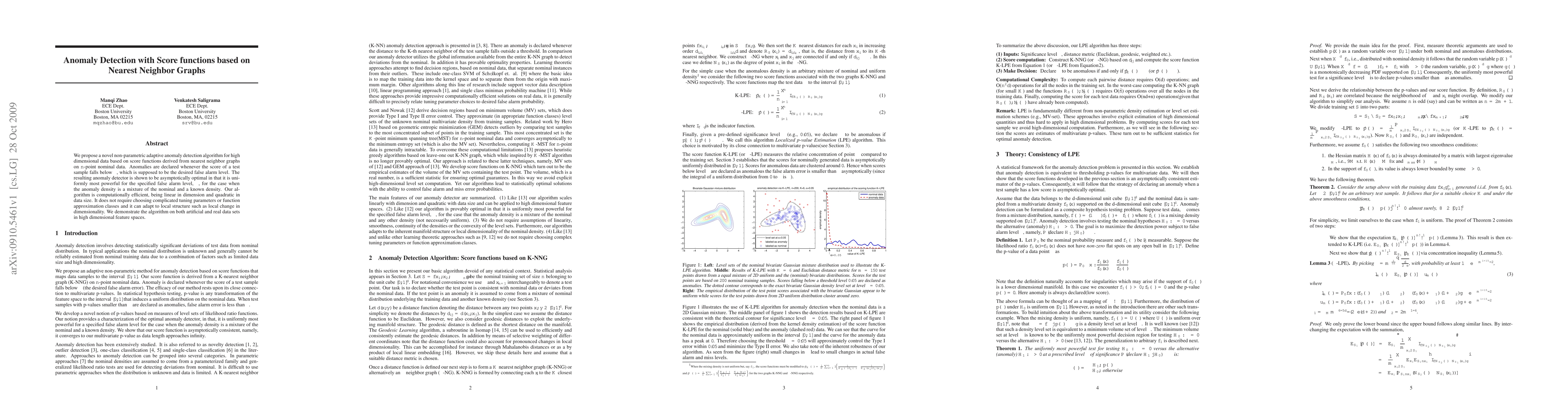 This paper introduces a non-parametric adaptive anomaly detection algorithm based on score functions derived from nearest neighbor graphs, which is computationally efficient and adapts to local data structures. The method is shown to be asymptotically optimal and effective for detecting anomalies in high-dimensional data.