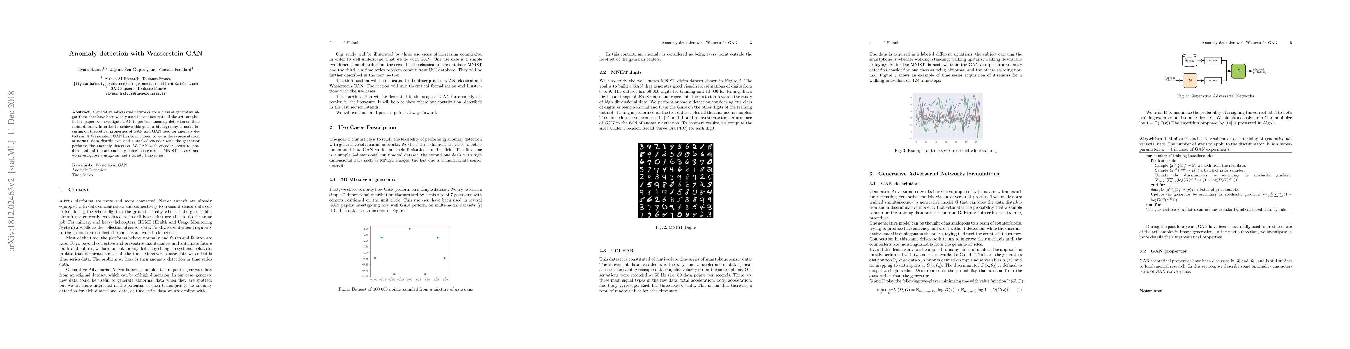 Generative adversarial networks are a class of generative algorithms that have been widely used to produce state-of-the-art samples. In this paper, we investigate GAN to perform anomaly detection on time series dataset. In order to achieve this goal, a bibliography is made focusing on theoretical properties of GAN and GAN used for anomaly detection. A Wasserstein GAN has been chosen to learn the representation of normal data distribution and a stacked encoder with the generator performs the anomaly detection. W-GAN with encoder seems to produce state of the art anomaly detection scores on MNIST dataset and we investigate its usage on multi-variate time series.