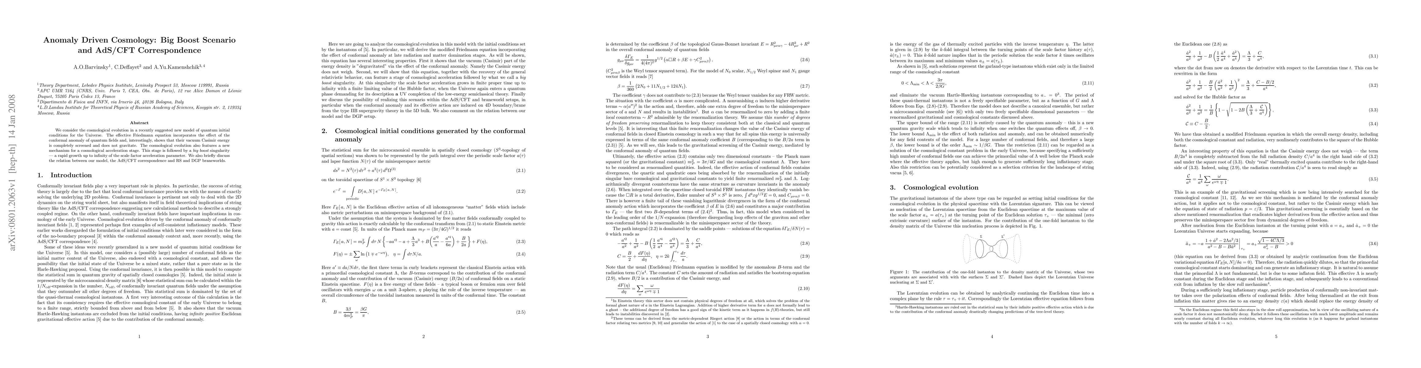 This paper explores a new model of quantum initial conditions for the universe where the conformal anomaly screens quantum vacuum energy, leading to a unique cosmological acceleration stage followed by a big boost singularity. It also connects this model to the AdS/CFT correspondence and braneworld scenarios.