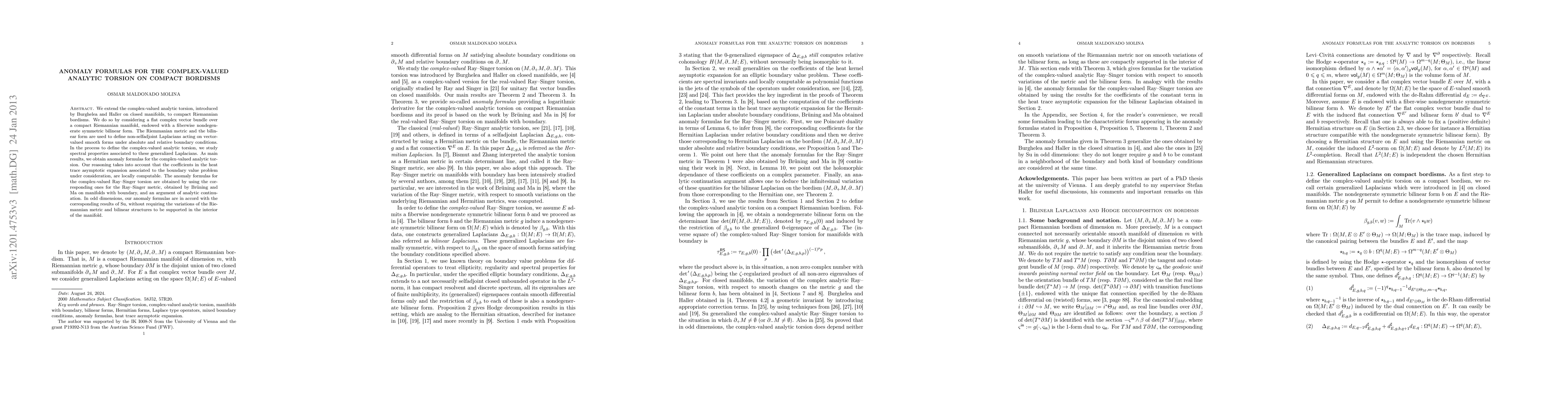 We extend the complex-valued analytic torsion, introduced by Burghelea and Haller on closed manifolds, to compact Riemannian bordisms. We do so by considering a flat complex vector bundle over a compact Riemannian manifold, endowed with a fiberwise nondegenerate symmetric bilinear form. The Riemmanian metric and the bilinear form are used to define non-selfadjoint Laplacians acting on vector-valued smooth forms under absolute and relative boundary conditions. In the process to define the complex-valued analytic torsion, we study spectral properties associated to these generalized Laplacians. As main results, we obtain anomaly formulas for the complex-valued analytic torsion. Our reasoning takes into account that the coefficients in the heat trace asymptotic expansion associated to the boundary value problem under consideration, are locally computable. The anomaly formulas for the complex-valued Ray--Singer torsion are obtained by using the corresponding ones for the Ray--Singer metric, obtained by Bruening and Ma on manifolds with boundary, and an argument of analytic continuation. In odd dimensions, our anomaly formulas are in accord with the corresponding results of Su, without requiring the variations of the Riemannian metric and bilinear structures to be supported in the interior of the manifold.