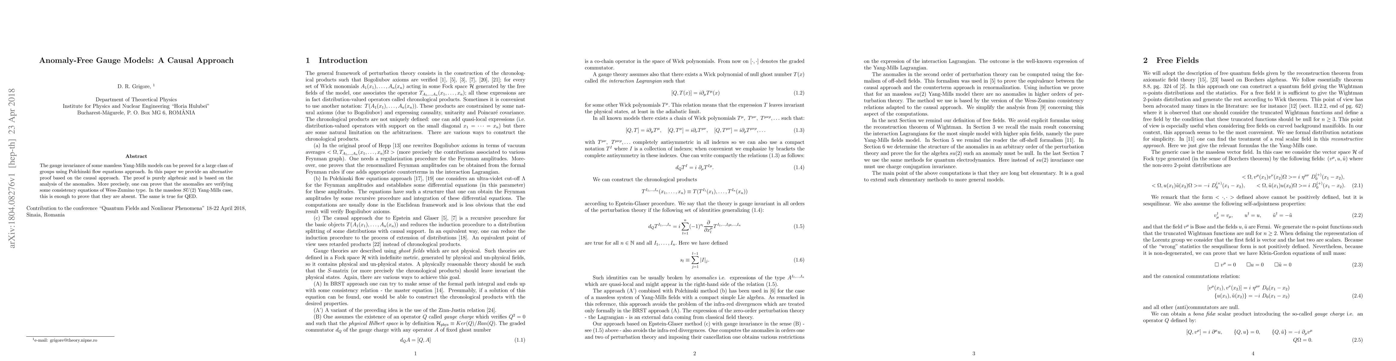 The gauge invariance of some massless Yang-Mills models can be proved for a large class of groups using Polchinski flow equations approach. In this paper we provide an alternative proof based on the causal approach. The proof is purely algebraic and is based on the analysis of the anomalies. More precisely, one can prove that the anomalies are verifying some consistency equations of Wess-Zumino type. In the massless SU(2) Yang-Mills case, this is enough to prove that they are absent. The same is true for QED.