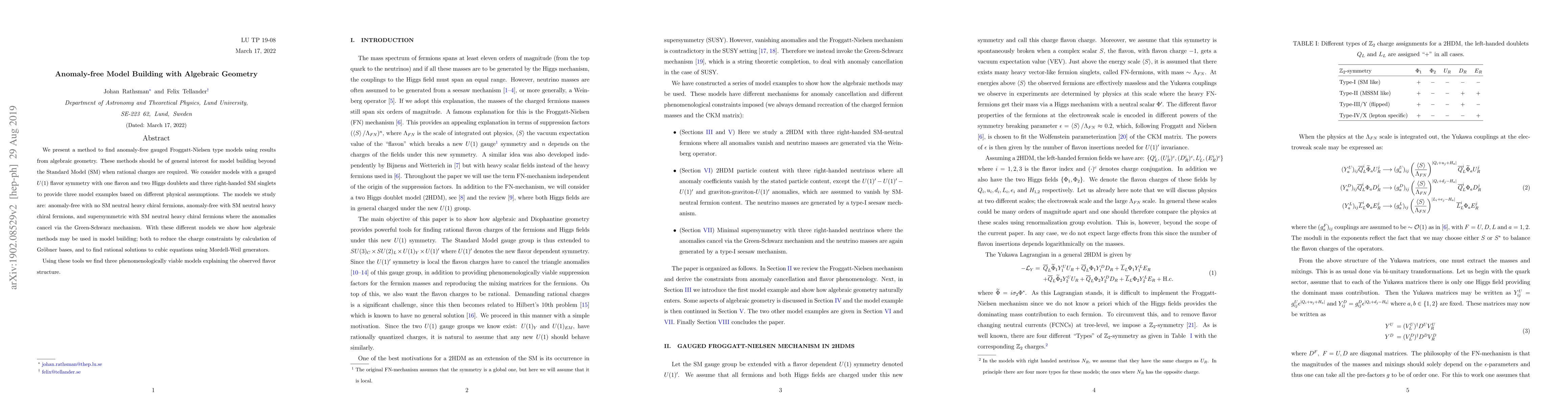 We present a method to find anomaly-free gauged Froggatt-Nielsen type models using results from algebraic geometry. These methods should be of general interest for model building beyond the Standard Model (SM) when rational charges are required. We consider models with a gauged $U(1)$ flavor symmetry with one flavon and two Higgs doublets and three right-handed SM singlets to provide three model examples based on different physical assumptions. The models we study are: anomaly-free with no SM neutral heavy chiral fermions, anomaly-free with SM neutral heavy chiral fermions, and supersymmetric with SM neutral heavy chiral fermions where the anomalies cancel via the Green-Schwarz mechanism. With these different models we show how algebraic methods may be used in model building; both to reduce the charge constraints by calculation of Gr\"obner bases, and to find rational solutions to cubic equations using Mordell-Weil generators. Using these tools we find three phenomenologically viable models explaining the observed flavor structure.