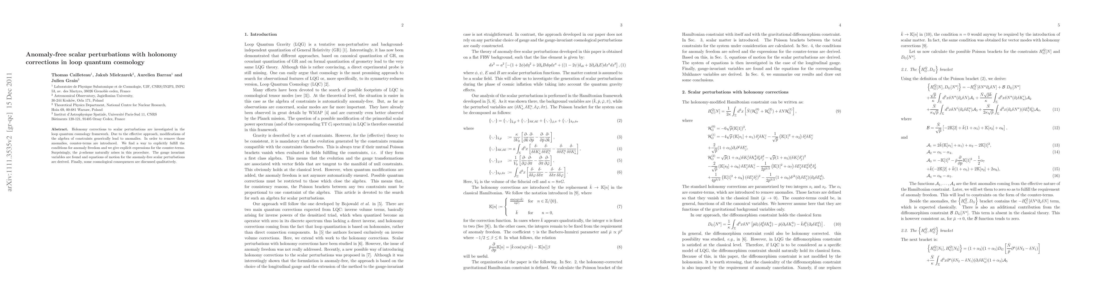 Holonomy corrections to scalar perturbations are investigated in the loop quantum cosmology framework. Due to the effective approach, modifications of the algebra of constraints generically lead to anomalies. In order to remove those anomalies, counter-terms are introduced. We find a way to explicitly fulfill the conditions for anomaly freedom and we give explicit expressions for the counter-terms. Surprisingly, the "new quantization scheme" naturally arises in this procedure. The gauge invariant variables are found and equations of motion for the anomaly-free scalar perturbations are derived. Finally, some cosmological consequences are discussed qualitatively.