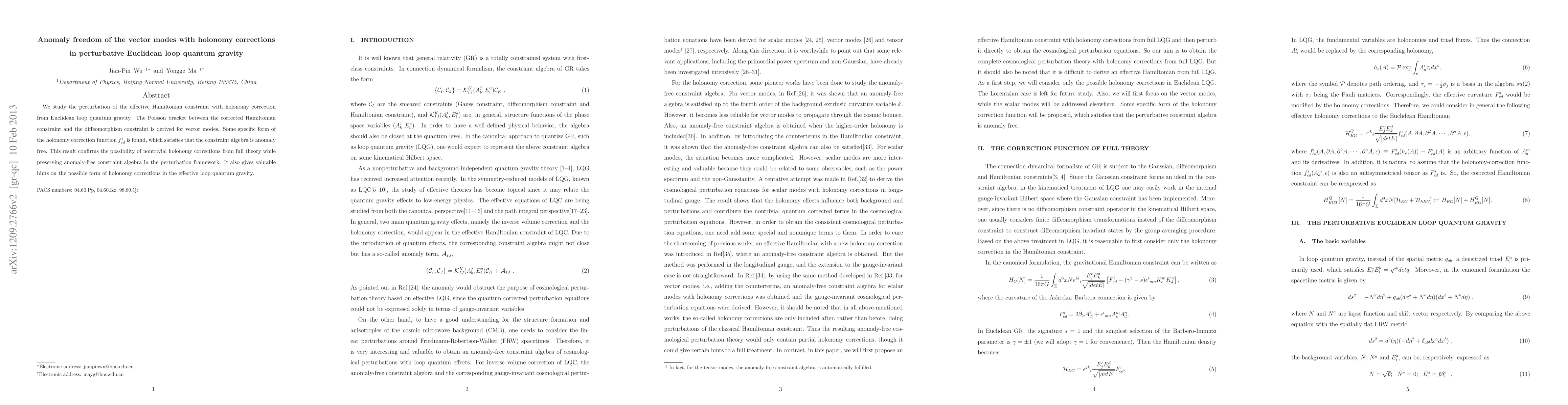We study the perturbation of the effective Hamiltonian constraint with holonomy correction from Euclidean loop quantum gravity. The Poisson bracket between the corrected Hamiltonian constraint and the diffeomorphism constraint is derived for vector modes. Some specific form of the holonomy correction function $f^{i}_{cd}$ is found, which satisfies that the constraint algebra is anomaly-free. This result confirms the possibility of non-trivial holonomy corrections from full theory while preserving anomaly-free constraint algebra in the perturbation framework. It also gives valuable hints on the possible form of holonomy corrections in effective loop quantum gravity.
