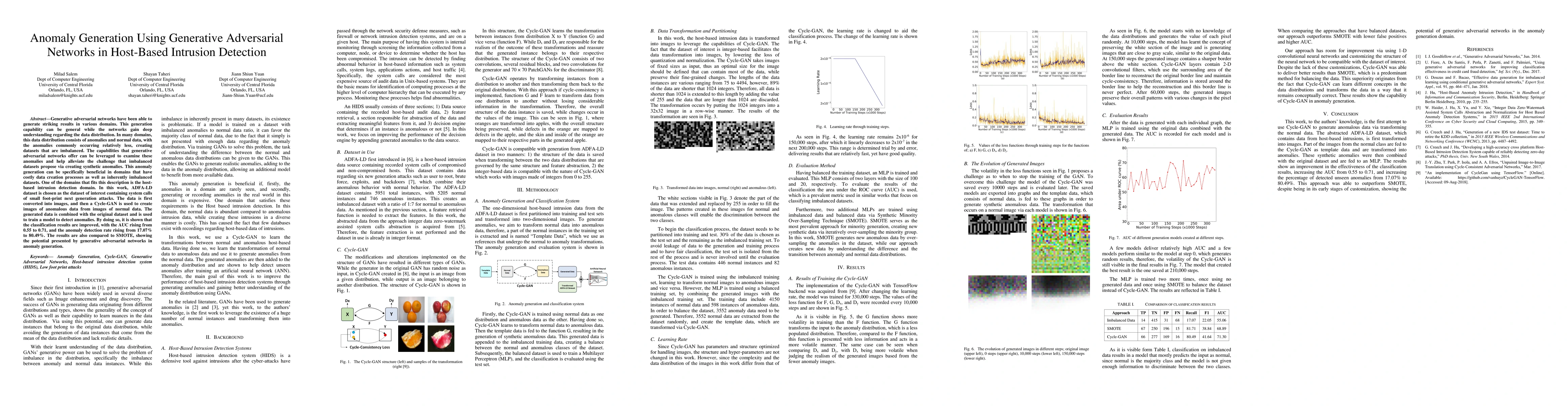 This paper explores using generative adversarial networks (GANs) to generate synthetic anomalies for host-based intrusion detection, addressing the challenge of imbalanced datasets. By converting data into images and employing Cycle-GAN, the study improves anomaly detection performance, raising the AUC from 0.55 to 0.71 and detection rate from 17.07% to 80.49%.