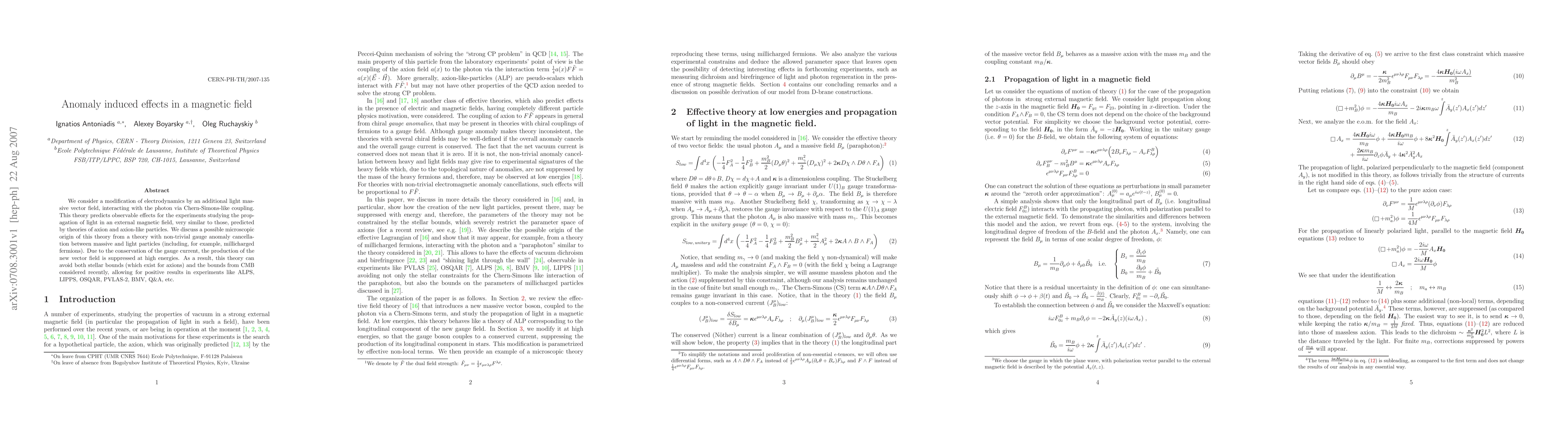 We consider a modification of electrodynamics by an additional light massive vector field, interacting with the photon via Chern-Simons-like coupling. This theory predicts observable effects for the experiments studying the propagation of light in an external magnetic field, very similar to those, predicted by theories of axion and axion-like particles. We discuss a possible microscopic origin of this theory from a theory with non-trivial gauge anomaly cancellation between massive and light particles (including, for example, millicharged fermions). Due to the conservation of the gauge current, the production of the new vector field is suppressed at high energies. As a result, this theory can avoid both stellar bounds (which exist for axions) and the bounds from CMB considered recently, allowing for positive results in experiments like ALPS, LIPPS, OSQAR, PVLAS-2, BMV, Q&A, etc.