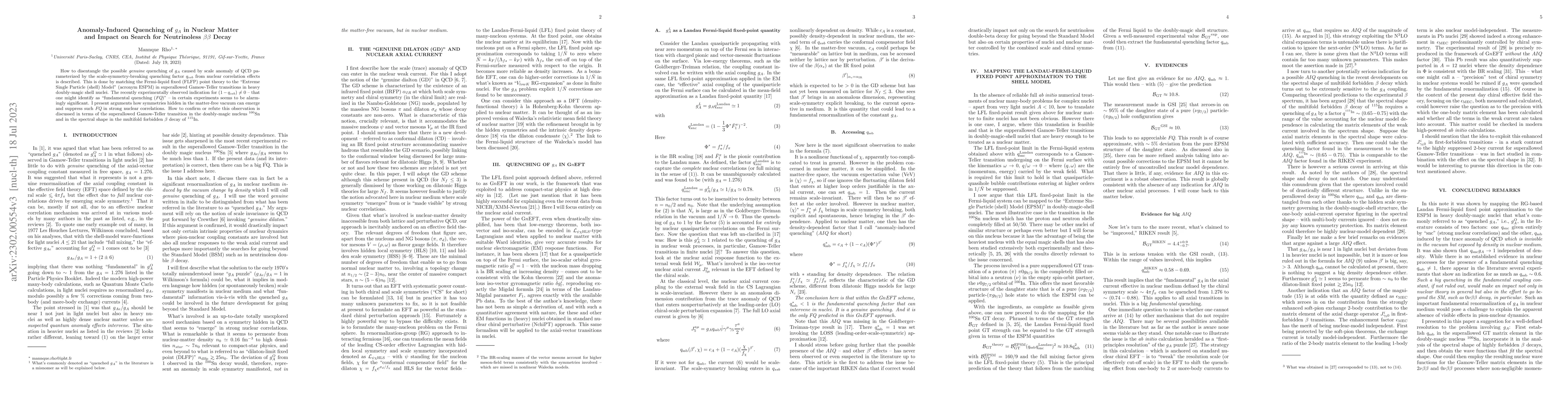 How to disentangle the possible {\it genuine} quenching of $g_A$ caused by scale anomaly of QCD parameterized by the scale-symmetry-breaking quenching factor $q_{ssb}$ from nuclear correlation effects is described. This is done by matching the Fermi-liquid fixed point (FLFP) theory to the ``Extreme Single Particle (shell) Model" (acronym ESPM) in superallowed Gamow-Teller transitions in heavy doubly-magic shell nuclei. The recently experimentally observed indication for $(1-q_{ssb})\neq 0$ -- that one might identify as ``fundamental quenching ({\it FQ})" -- in certain experiments seems to be alarmingly significant. I present arguments how symmetries hidden in the matter-free vacuum can emerge and suppress such {\it FQ} in strong nuclear correlations. How to confirm or refute this observation is discussed in terms of the superallowed Gamow-Teller transition in the doubly-magic nucleus $^{100}$Sn and in the spectral shape in the multifold forbidden $\beta$ decay of $^{115}$In.
