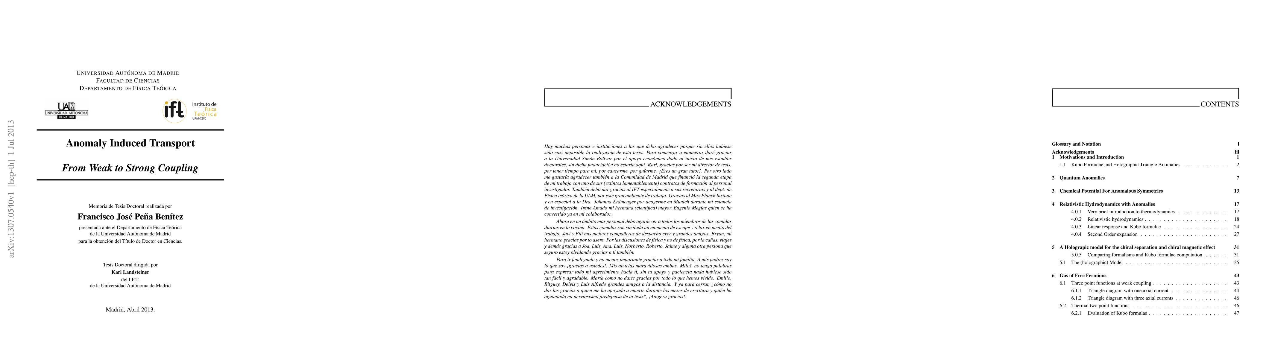 The existence of new transport phenomena associated to the presence of quantum anomalies has atracted very recently the attention of theorist. These transport coefficient have very interesting properties, for example, they do not renormalize. The most famous case of anomaly induced transport phenomena is the Chiral Magnetic Effect, in which an electric current is produced by a magnetic field if the system has a different number of right handed fermions respect the left handed one. In this thesis we have studied those transport coefficients from Kubo formulas at weak and strong coupling. To finish a fluid/gravity approach is used to compute all the second order anomalous coefficients in an anomalous conformal fluid.
