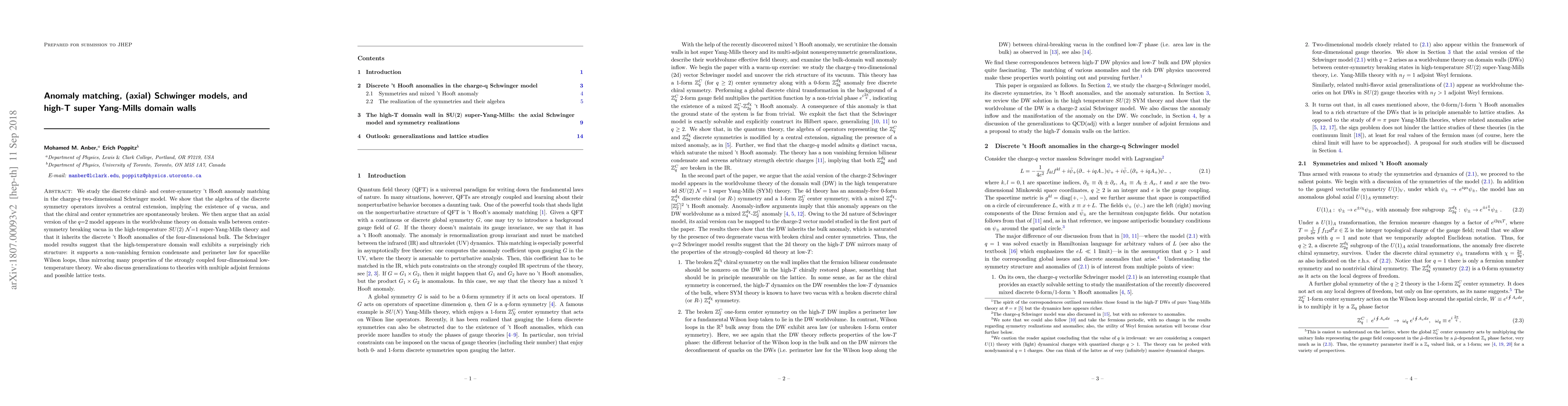 This paper investigates the 't Hooft anomaly matching in the 2D Schwinger model, revealing spontaneous symmetry breaking and the existence of multiple vacua. It further explores the axial version of the model on domain walls in high-temperature SU(2) N=1 super Yang-Mills, showing it inherits anomalies from the bulk and exhibits properties akin to the low-temperature theory.