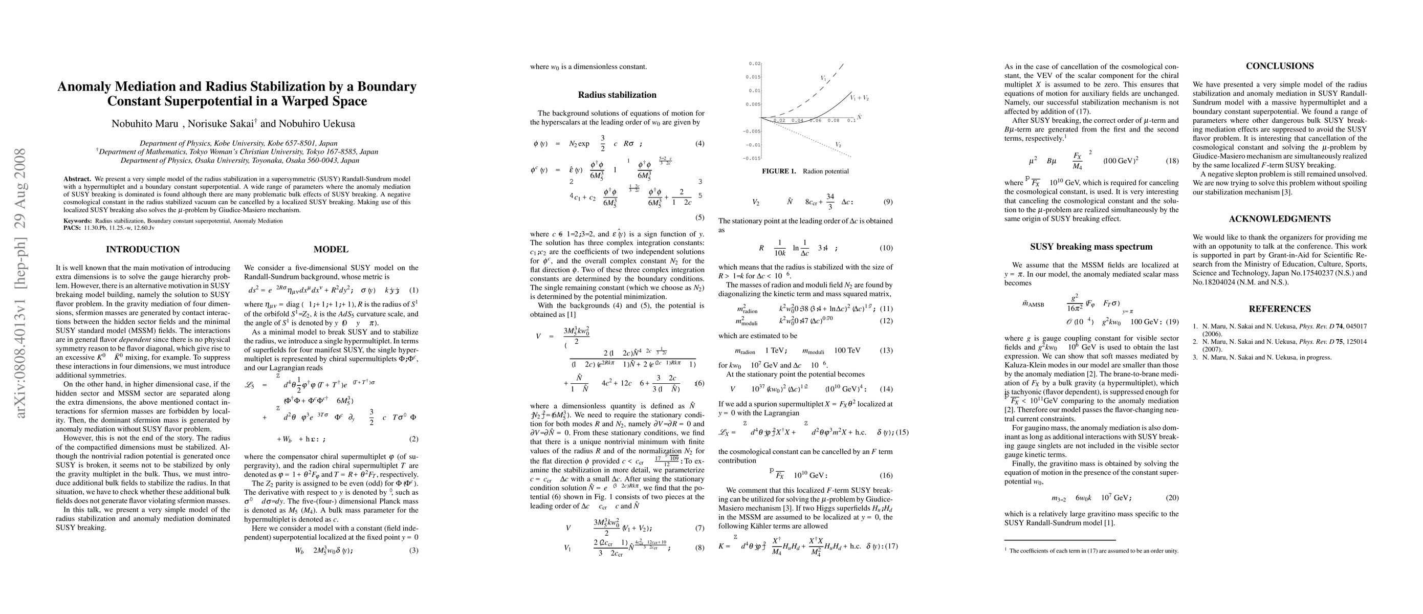 This paper proposes a simple model for radius stabilization in a supersymmetric Randall-Sundrum scenario using a hypermultiplet and a boundary constant superpotential. It finds a parameter range where anomaly mediation dominates SUSY breaking, while addressing the \mu-problem via the Giudice-Masiero mechanism and canceling the negative cosmological constant.
