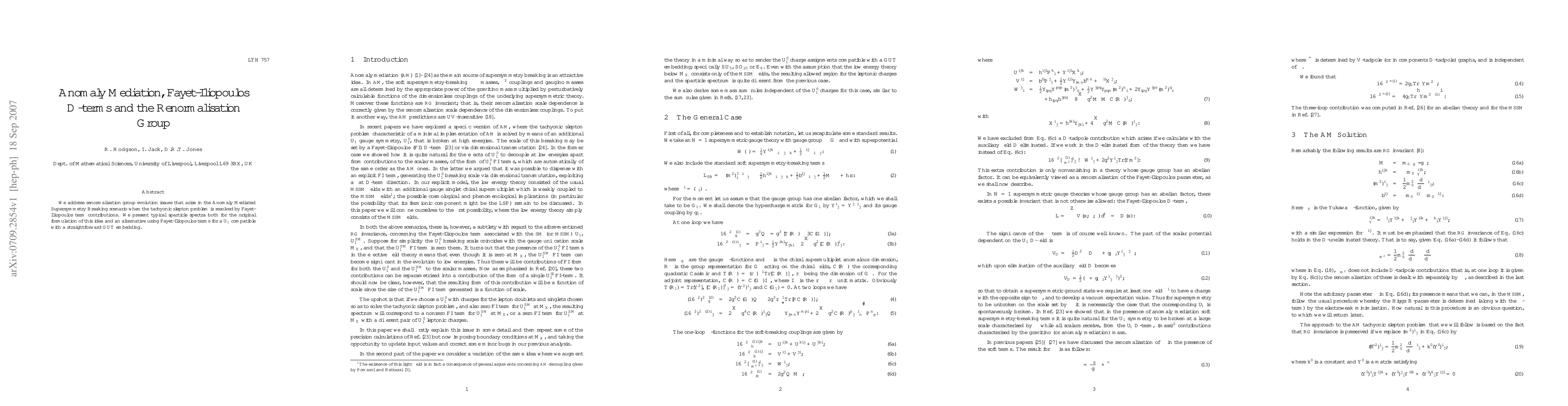 This paper examines the renormalisation group evolution in Anomaly Mediated Supersymmetry Breaking, focusing on how Fayet-Iliopoulos D-terms resolve the tachyonic slepton issue. It compares sparticle spectra between the traditional approach and a new method using compatible U(1) Fayet-Iliopoulos terms for GUT embedding.