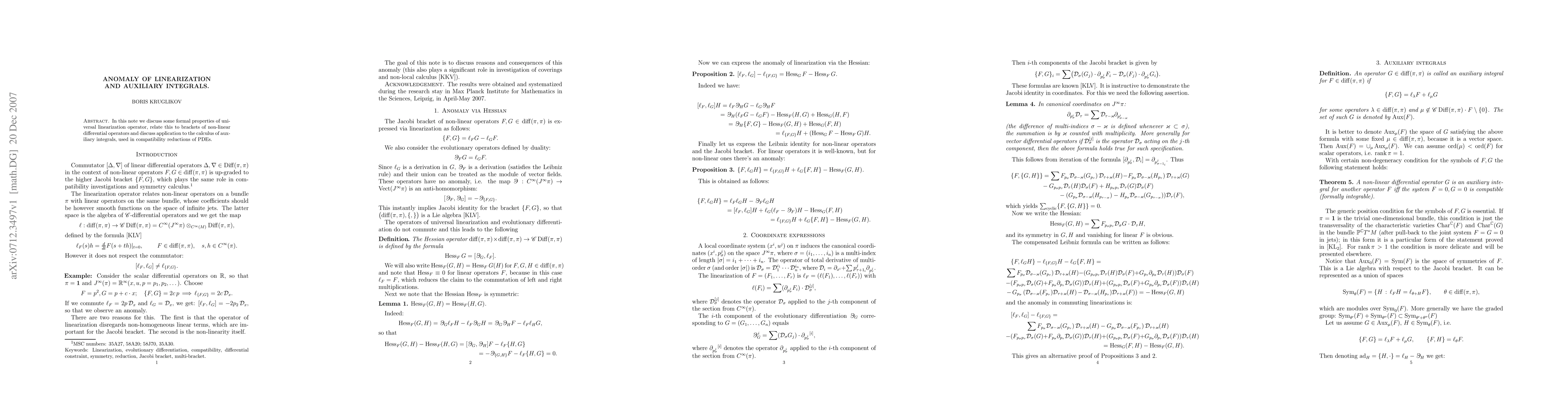In this note we discuss some formal properties of universal linearization operator, relate this to brackets of non-linear differential operators and discuss application to the calculus of auxiliary integrals, used in compatibility reductions of PDEs.