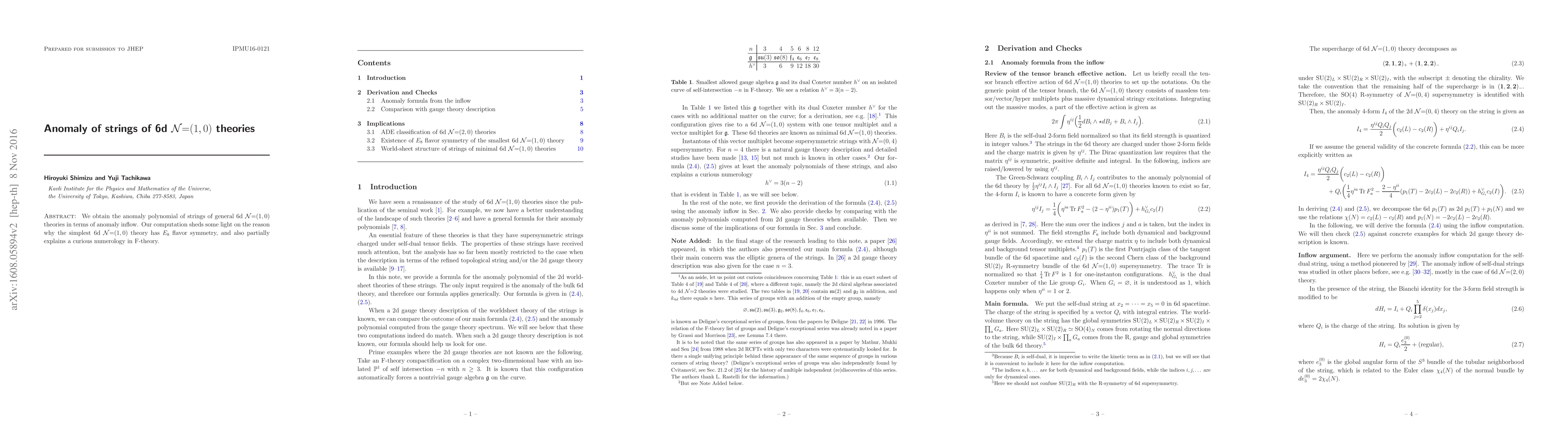 This paper computes the anomaly polynomial for strings in 6d $\mathcal{N}{=}(1,0)$ theories, providing insights into the $E_8$ flavor symmetry of the simplest theory and a partial explanation for a numerology in F-theory.